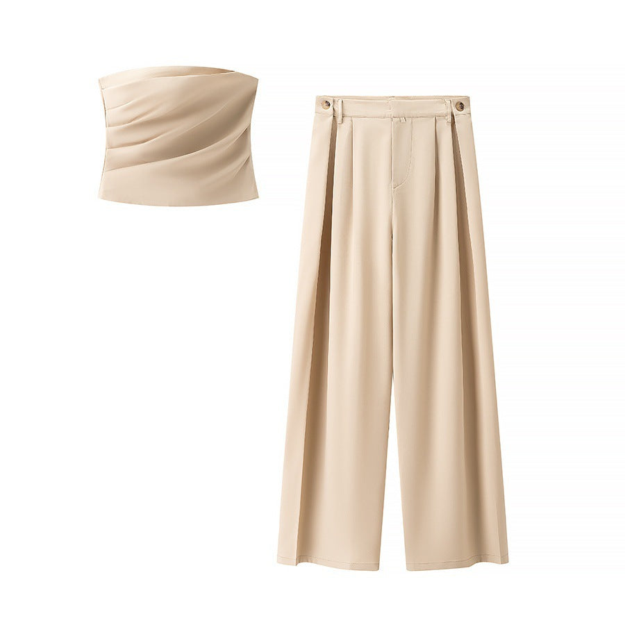 Uppsättningen består av en förfinad topp med en axelfri design som framhäver din silhuett, samt breda byxor som erbjuder en avslappnad passform. Den är idealisk för både formella och informella tillfällen, vilket gör den till ett mångsidigt tillskott i din garderob.