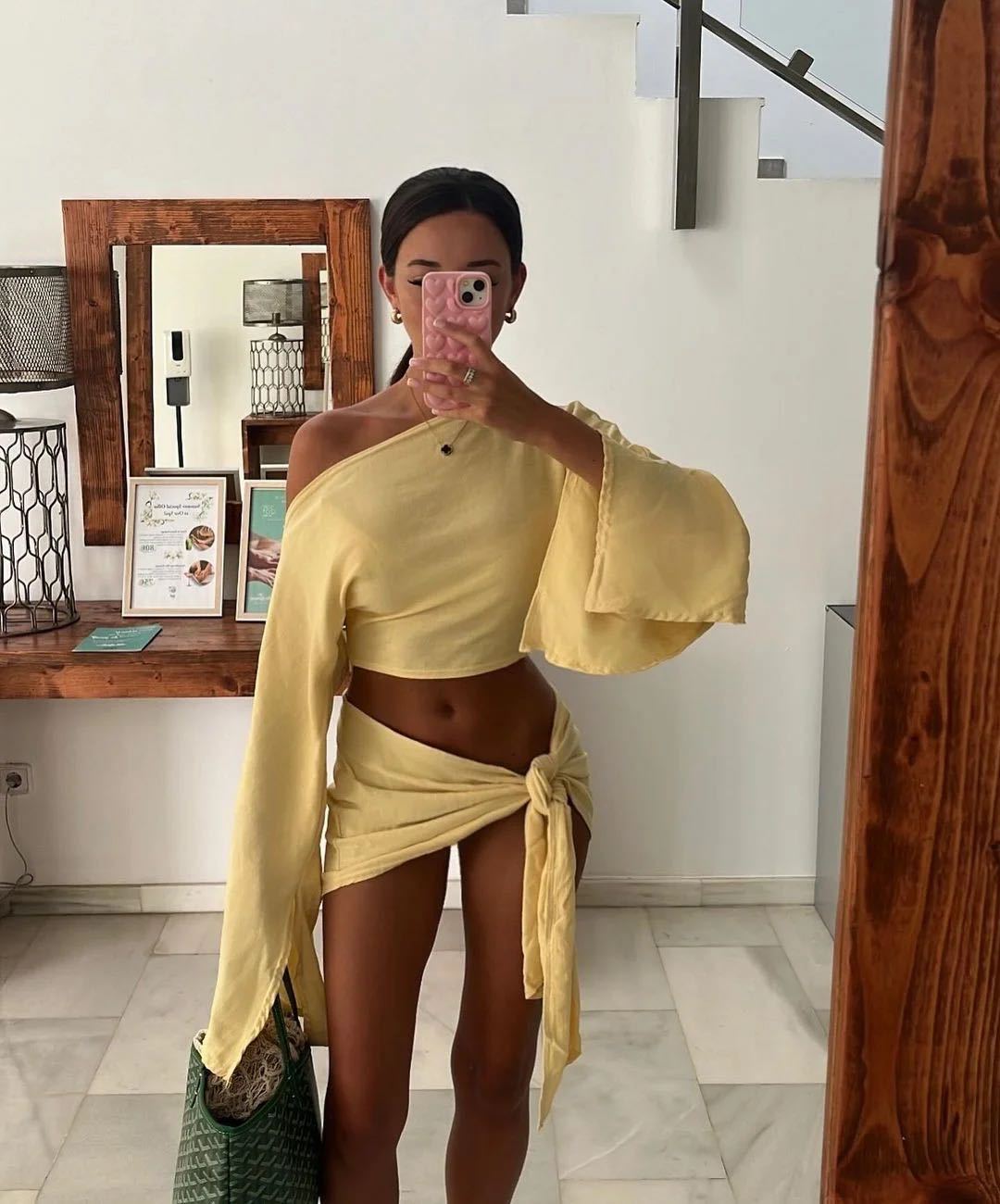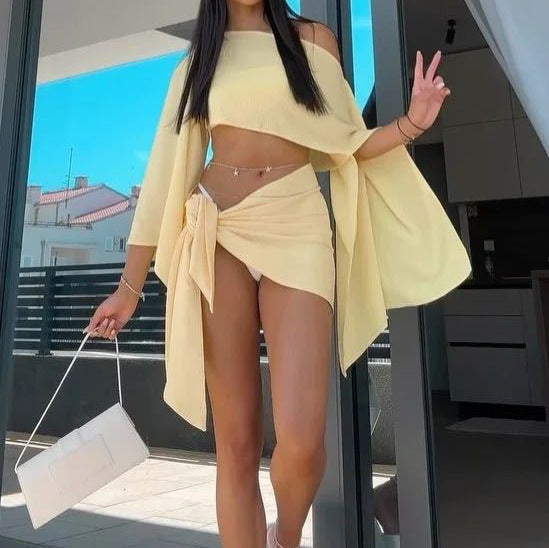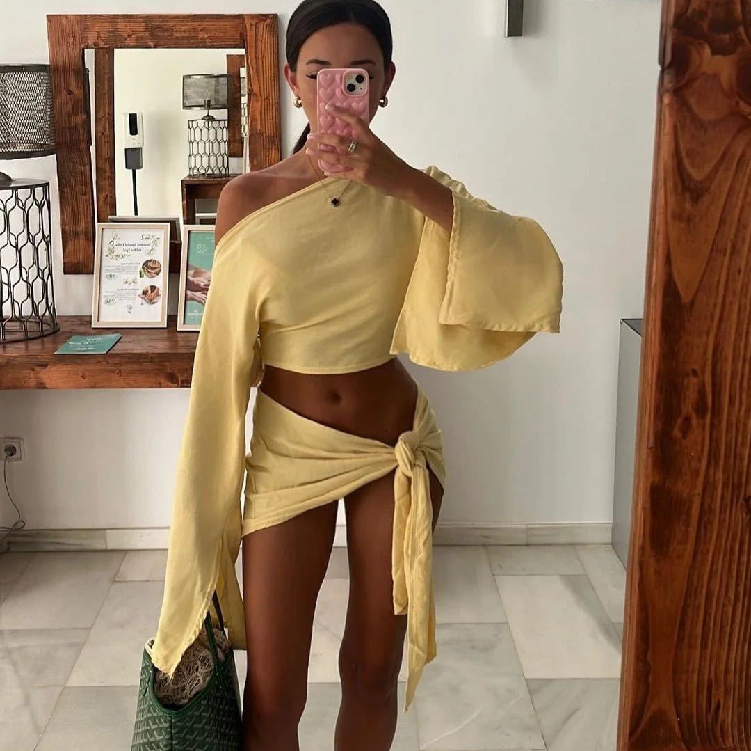 Upplev en perfekt kombination av stil och komfort med denna eleganta beskurna topp och wrap-kjol. Denna ensemble är designad för att ge dig en känsla av frihet och stil under varma sommardagar och avslappnade kvällar.