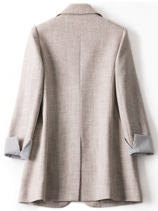 Blazern är tillverkad av en hållbar blandning av bomull, polyester och spandex, vilket gör den idealisk för affärsmöten eller formella tillställningar. Den har en V-ringning och en stilren design som passar perfekt för den moderna kvinnan.