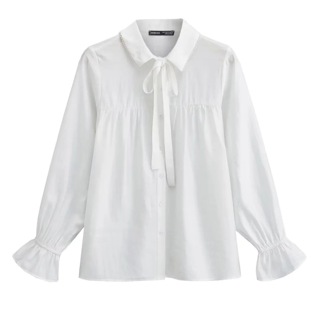 Upplev elegansen och komforten med denna stiliga blus som är designad för att framhäva din feminina sida. Den bundna kragen och de dekorativa rufsarna ger en unik och sofistikerad look som passar perfekt för alla tillfällen.