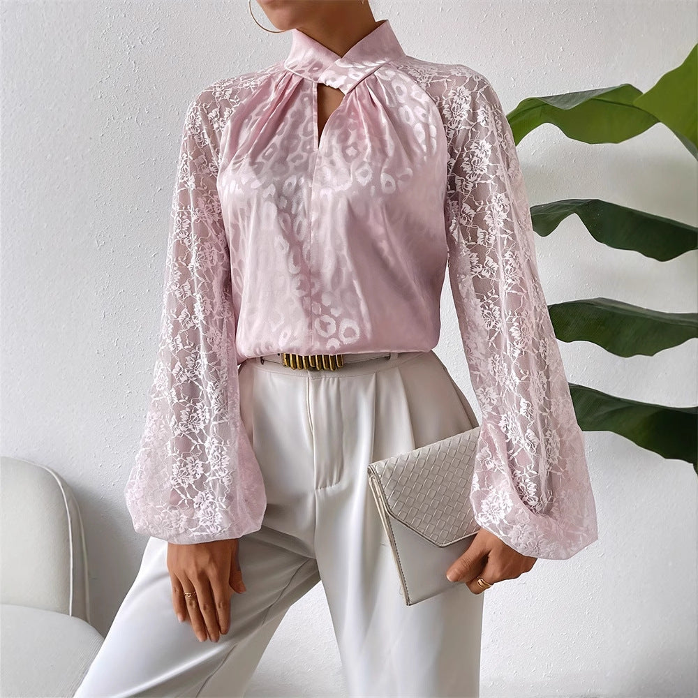 Kvinnors Blus Transparenta Spetsärmar Ståkrage Lätt Tyg