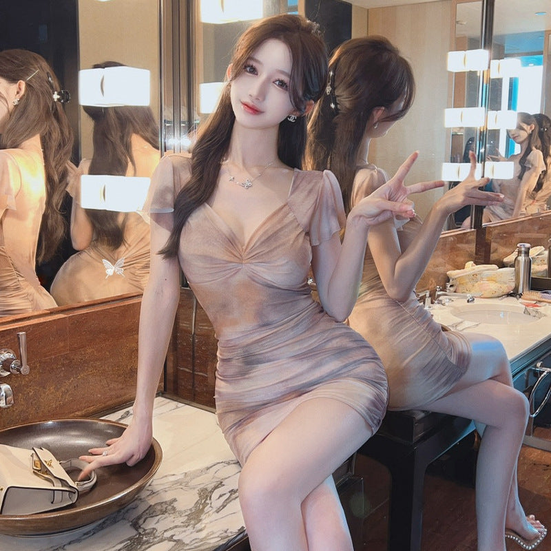 Denna klänning har en modern design med rynkade detaljer och en V-halsringning som ger en sofistikerad look. Den korta kjolen och de korta ärmarna gör den idealisk för varma dagar eller kvällar, vilket gör den till ett mångsidigt val för din garderob.