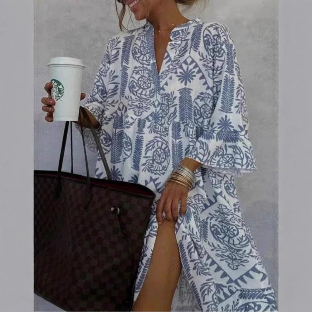 Denna klänning har en A-linjeformad kjol som faller elegant och en V-ringning som framhäver din stil. Med tre fjärdedelar ärmar och ett unikt tryck, är den både trendig och tidlös.