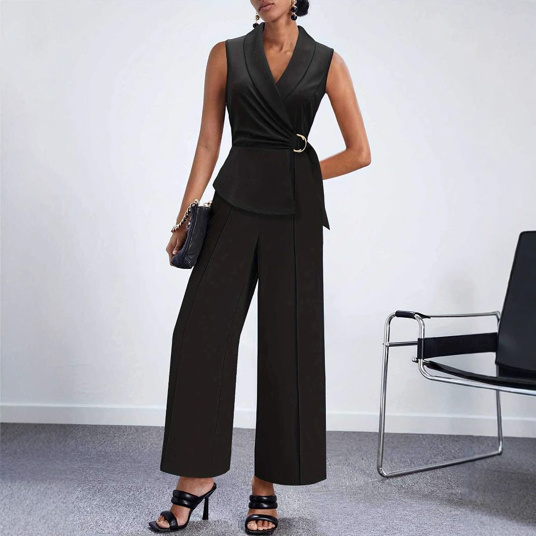 Designen är både mångsidig och smickrande, vilket gör att du kan bära den vid affärsmöten, kvällsevenemang eller för en avslappnad look. De breda byxorna ger en modern silhuett, medan den lindande toppen framhäver din figur på ett vackert sätt.