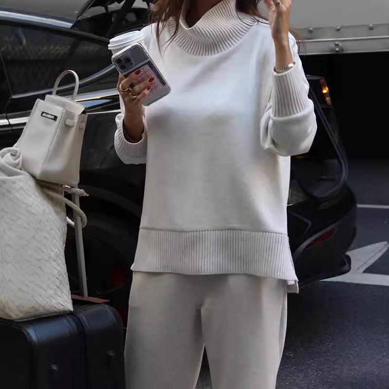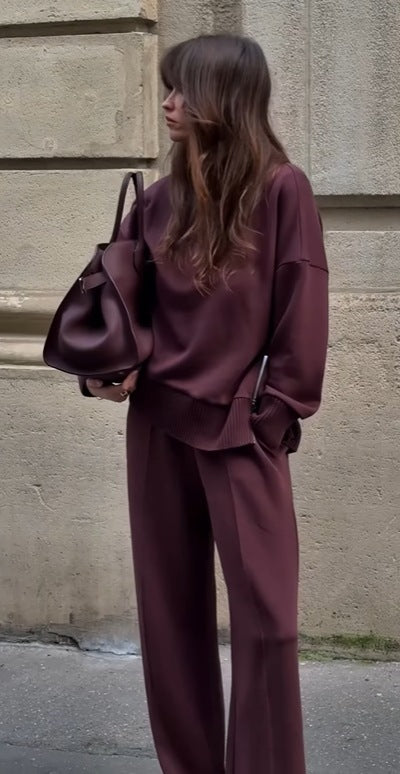 Denna dräkt består av en avslappnad topp och bekväma byxor, vilket gör den idealisk för både vardagliga aktiviteter och avslappnade utflykter. Med sin moderna silhuett och ribbade detaljer på ärmarna och nederkanten, erbjuder den både stil och funktionalitet.