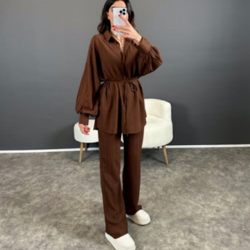 Setet består av en vacker spetsskjorta med puffärmar och avslappnade byxor, vilket ger en modern och trendig look. Den enfärgade designen gör det enkelt att styla för olika tillfällen, från en dag på stan till en avslappnad kväll med vänner.