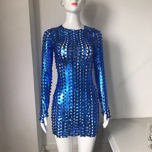 Med en strålande yta och unika utskärningar erbjuder klänningen en modern och trendig look. Den är perfekt för fester, kvällsevenemang eller andra speciella tillfällen, vilket gör den till ett mångsidigt val för din garderob.