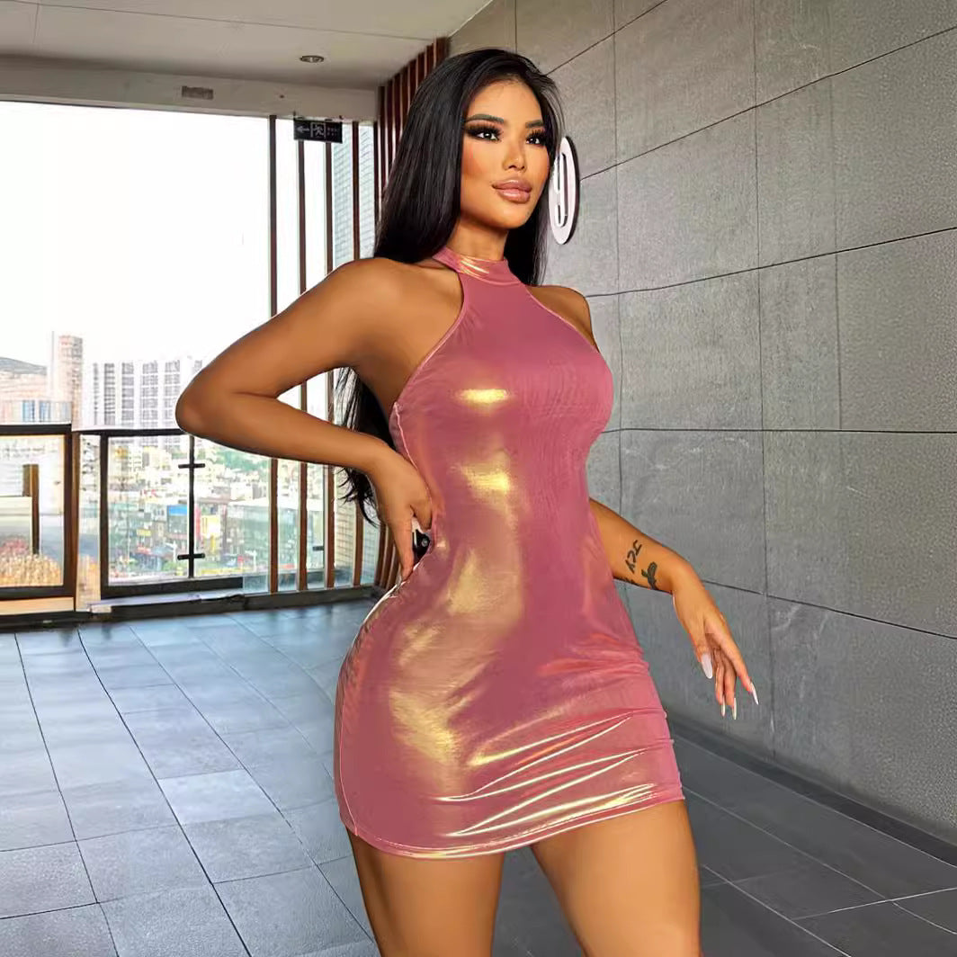 Upplev en fantastisk känsla med vår korta, glänsande miniklänning, perfekt för oförglömliga kvällar. Denna klänning framhäver din silhuett på ett fördelaktigt sätt och ger dig en självsäker look.