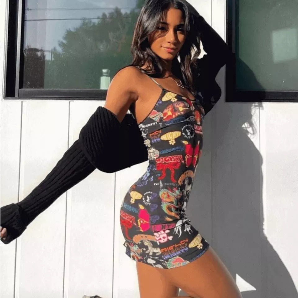 Klänningen har en modern och kreativ design som gör den perfekt för både avslappnade och festliga tillfällen. Med sin figurnära passform framhäver den din silhuett på ett elegant sätt, vilket gör den till ett utmärkt val för varma dagar.
