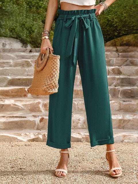 Designen med hög midja och justerbar sladd ger en elegant touch, vilket gör dem perfekta för både avslappnade utflykter och hemmabruk. Dessa byxor är ett mångsidigt tillskott till din garderob som passar för olika tillfällen.