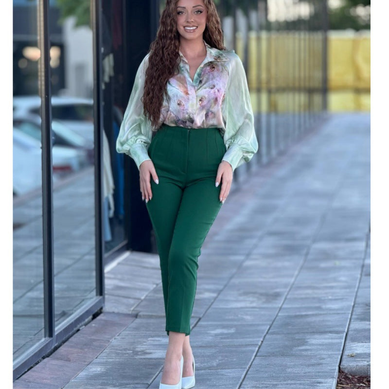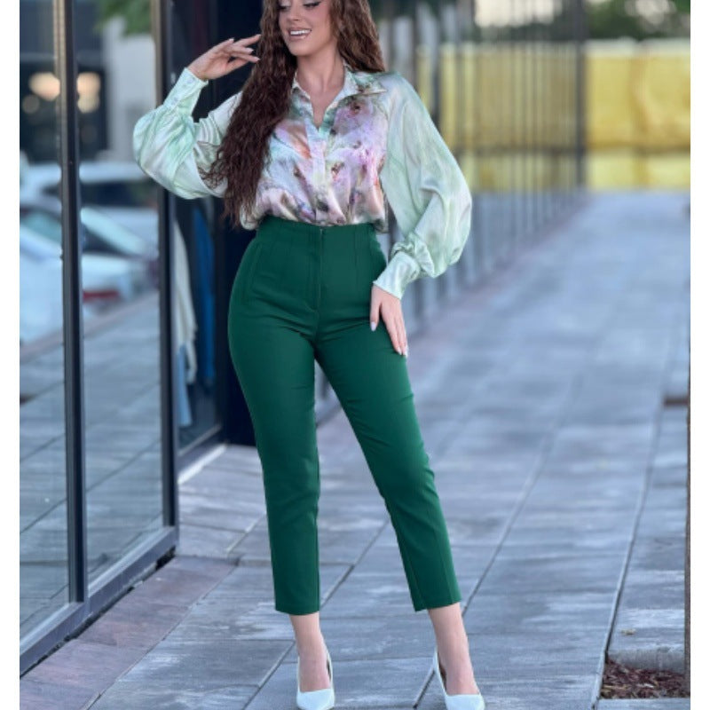 Designen kombinerar en hög midja med klippta ben, vilket skapar en modern silhuett. Dessa byxor är idealiska för både vardagligt bruk och mer formella tillfällen, vilket gör dem till ett mångsidigt val för varje kvinna.