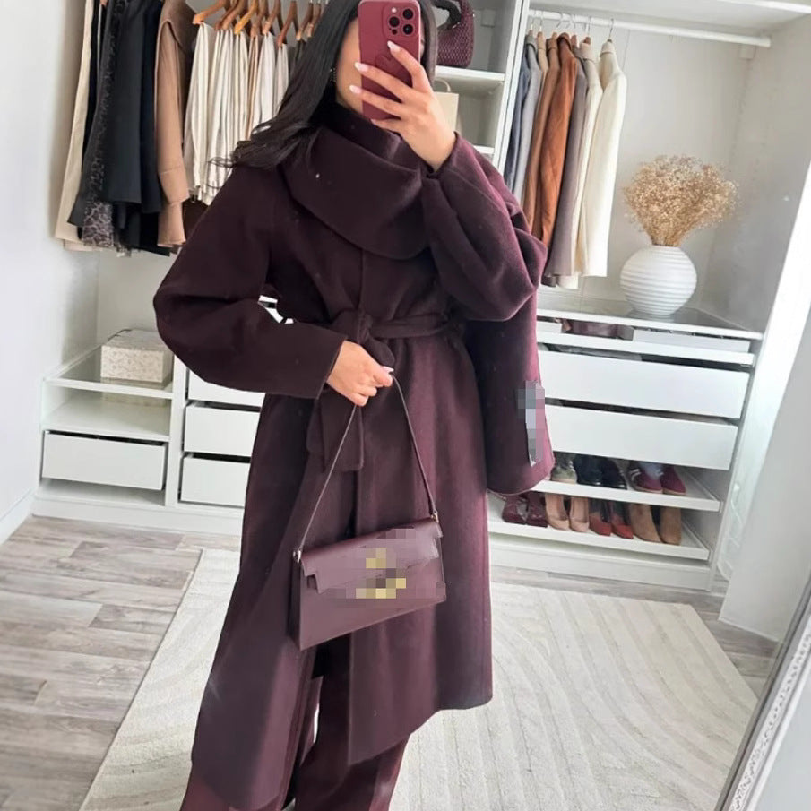 Med ett samtida utseende och en rymlig krage, är denna kappa både praktisk och stilren. Det praktiska bältet betonar midjan och ger en smickrande silhuett, vilket gör den till ett utmärkt val för affärsmöten eller eleganta tillställningar.