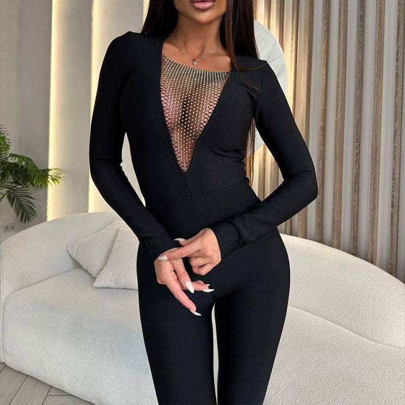 Upplev en perfekt kombination av stil och komfort med denna eleganta kroppsdräkt. Den djupa V-halsen och den unika nätverksdesignen framhäver din figur och ger en förförisk look.