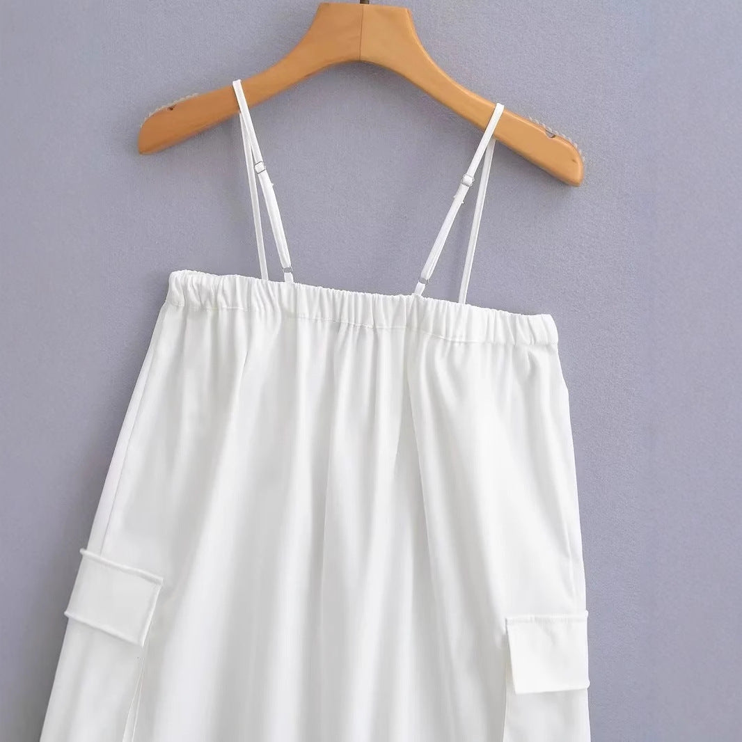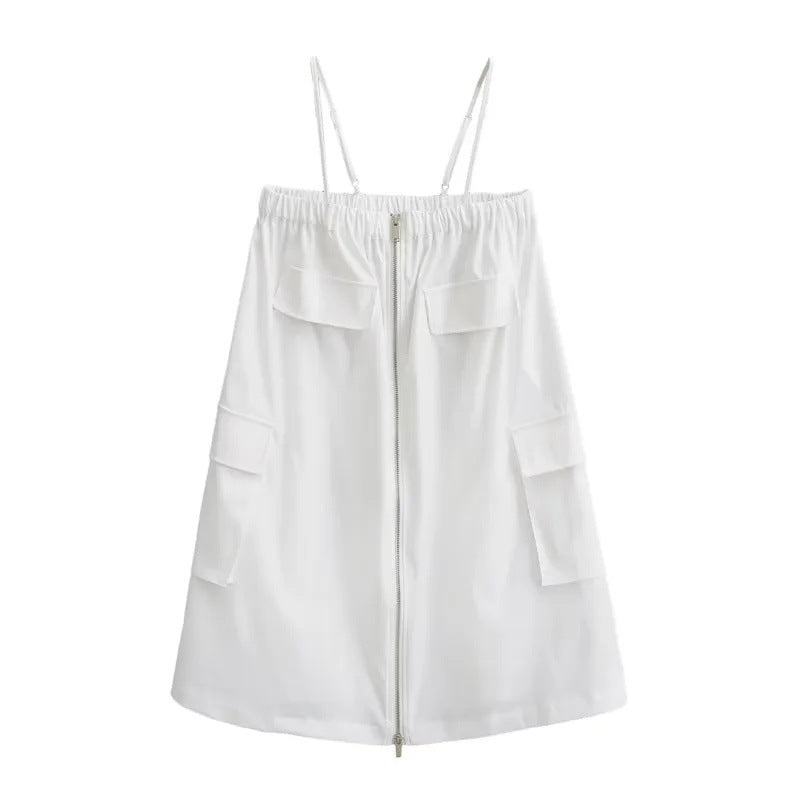 Denna klänning har en unik design med praktiska detaljer som gör den lätt att bära. Med en justerbar bärare och en dragkedja fram kan du enkelt anpassa passformen. Klänningen är idealisk för både avslappnade och mer eleganta tillfällen, vilket gör den mångsidig och stilren.