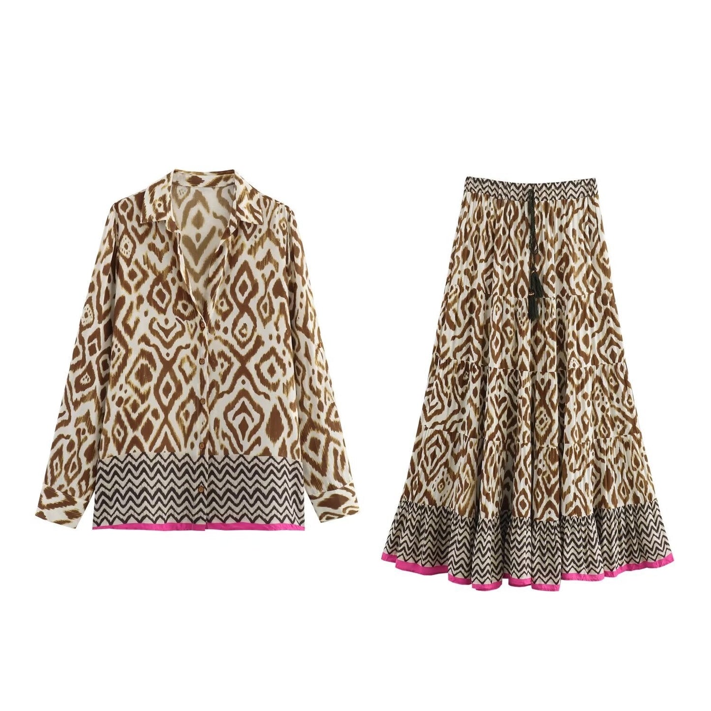Detta set är designat för att ge en avslappnad men ändå trendig känsla, vilket gör det idealiskt för både vardagliga och festliga tillfällen. Med långa ärmar och en midi-längd på kjolen, erbjuder det både komfort och stil.