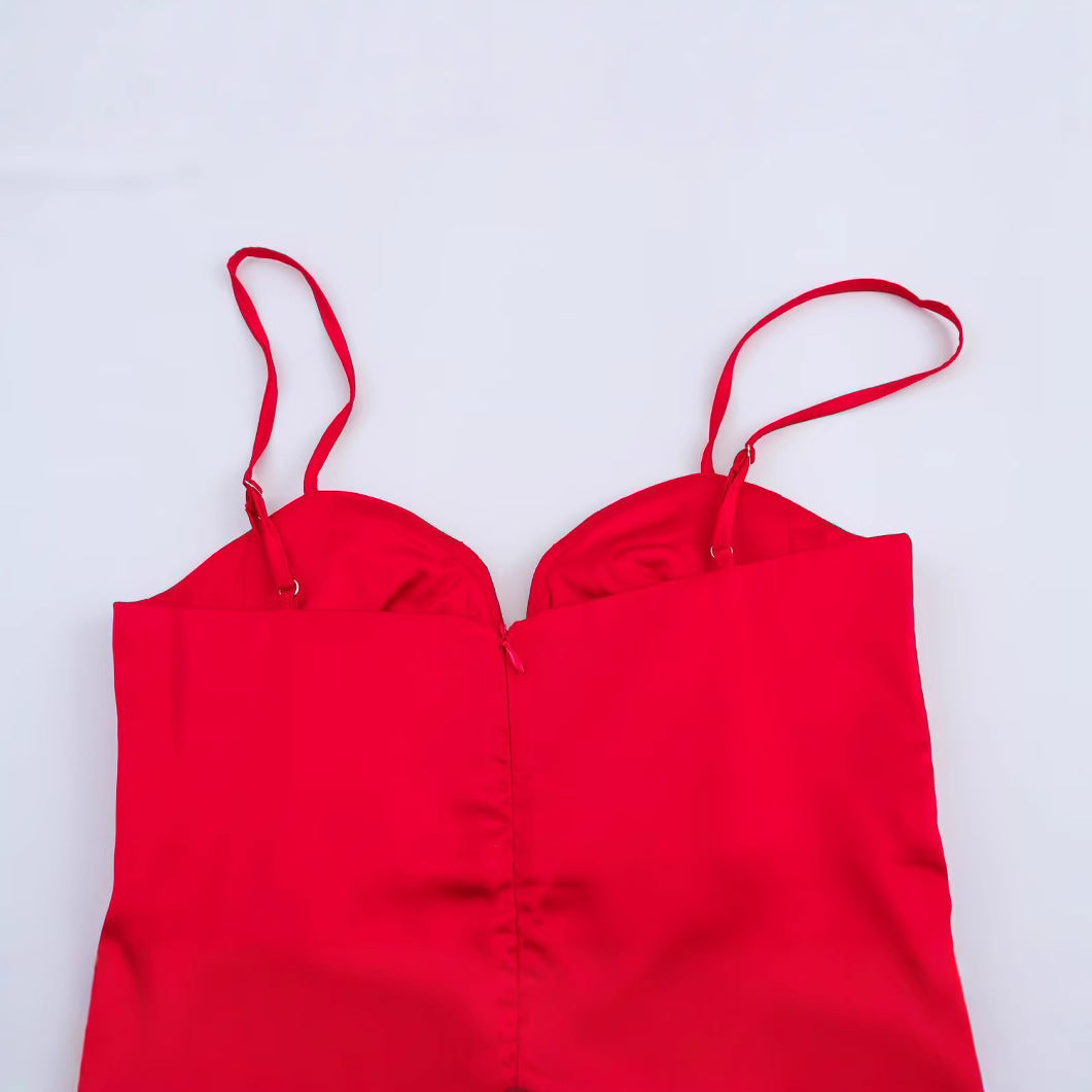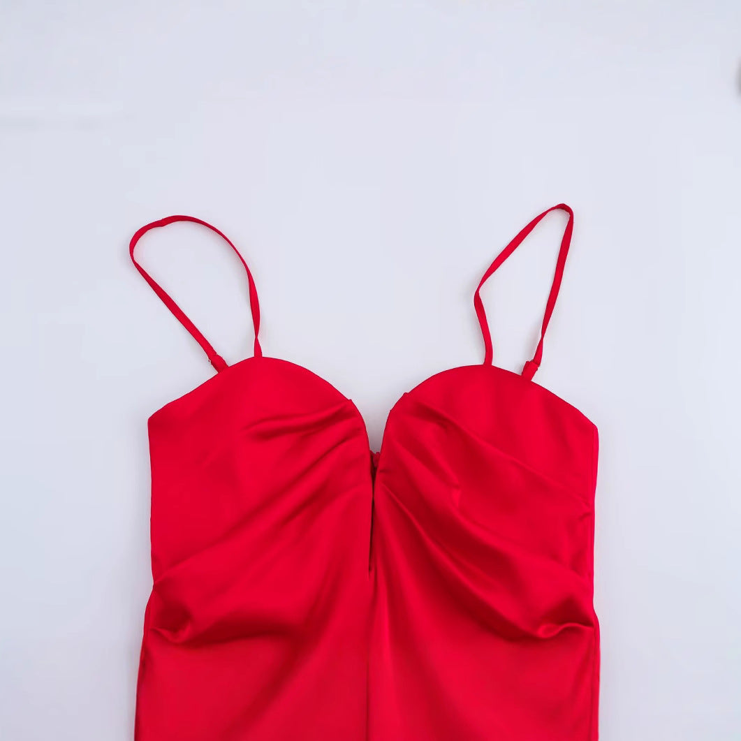 Denna klänning har en tidlös design med spaghetti band och en vacker midi-längd. Den monokroma stilen gör den lätt att styla för olika tillfällen, oavsett om det är en kväll ute eller en brunch med vänner.