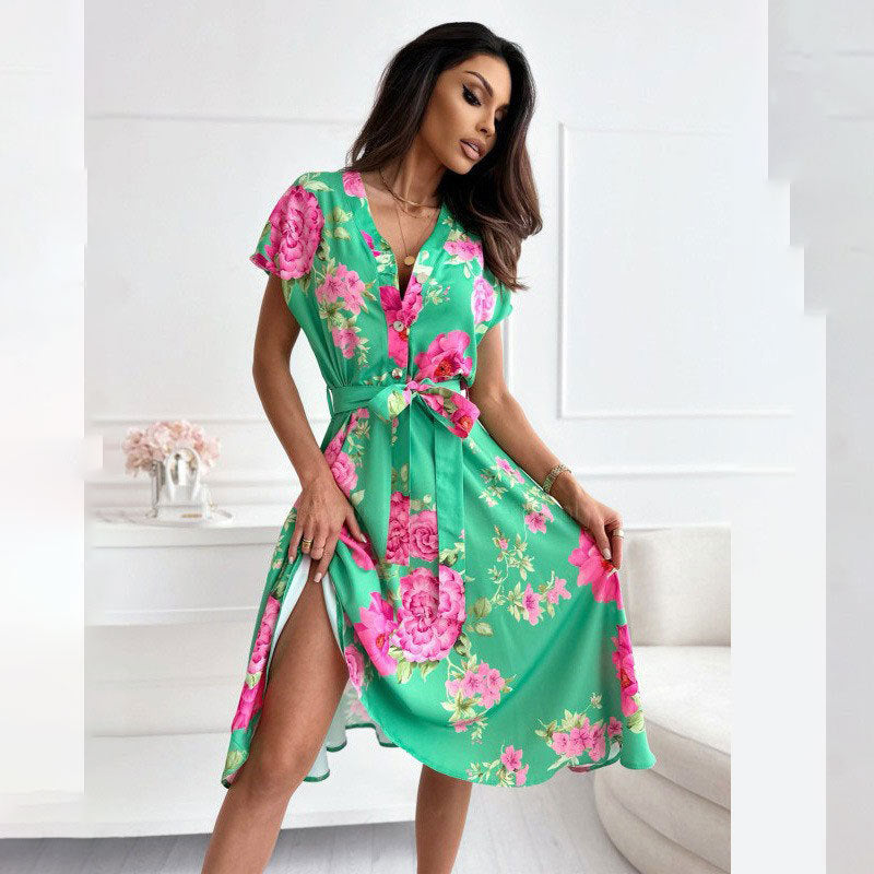 Klänningen har en v-ringad halsringning och knappar som ger en stilren look. Den är designad med en A-linjeform som smickrar figuren och passar utmärkt för olika kroppstyper. Med korta ärmar är den idealisk för varmare dagar eller kan enkelt kombineras med en jacka för kyligare kvällar.