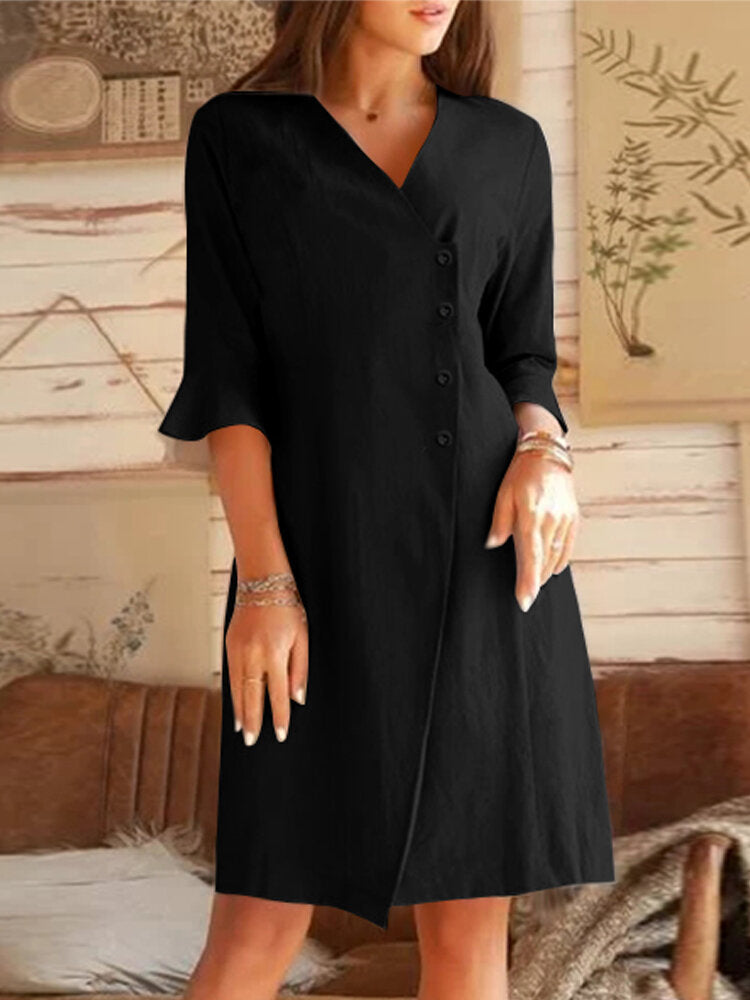 Klänningen har en asymmetrisk knappdesign som ger en unik touch. Den är idealisk för både kontorsmiljöer och avslappnade sammankomster, vilket gör den till ett mångsidigt plagg i din garderob.