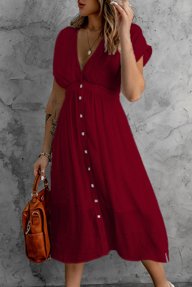 Upplev en tidlös elegans med denna midi-klänning som är perfekt för både kontoret och kvällsevenemang. Den vackra V-ringningen och de korta ärmarna ger en feminin touch som gör att du känner dig självsäker och stilfull.