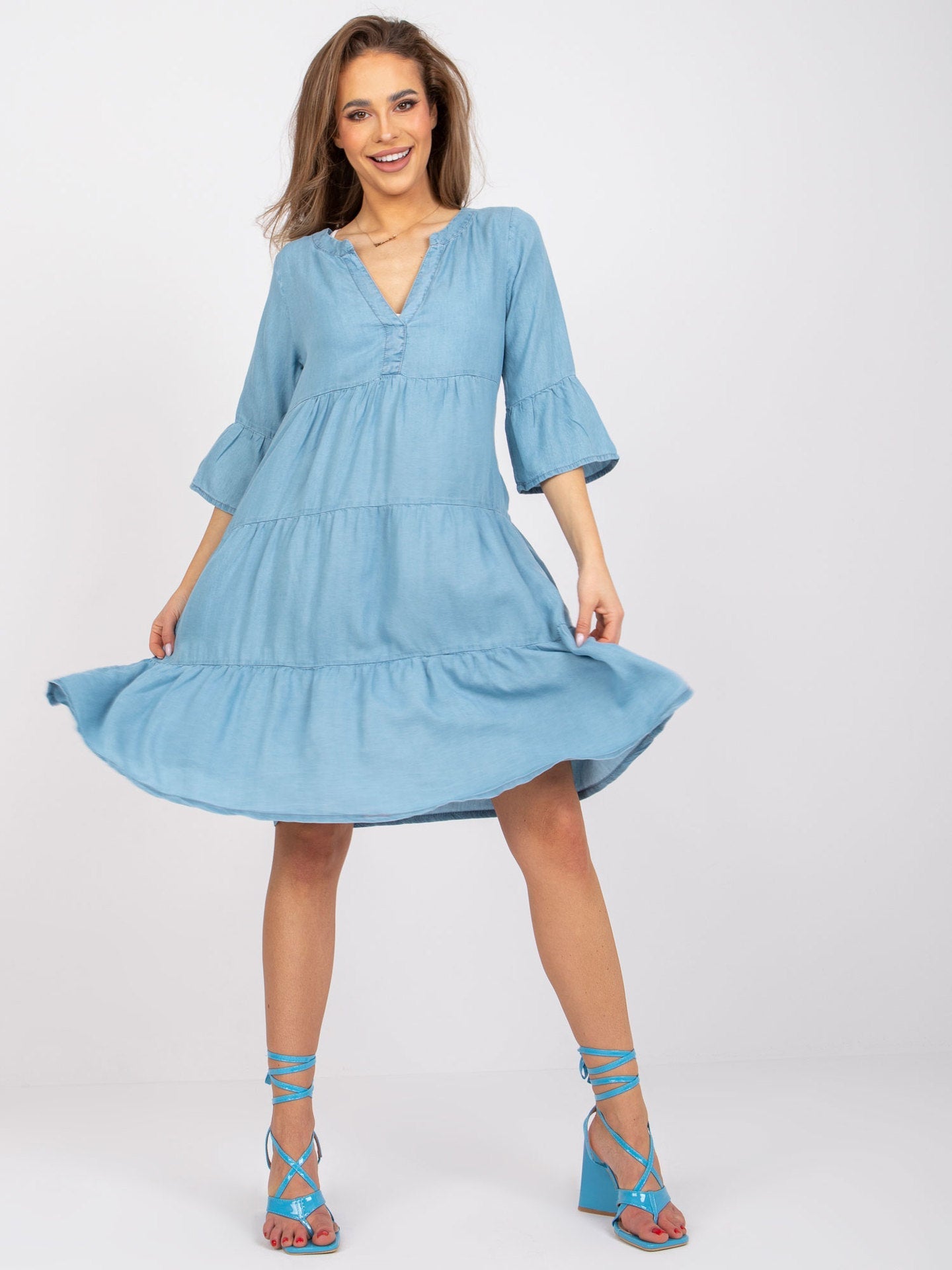 Denna midi klänning med V-ringning är perfekt för att skapa en stilfull och bekväm look. Känn dig självsäker och elegant oavsett tillfälle när du bär denna klänning.