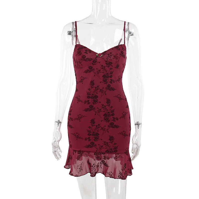 Klänningen har ett delikat blommönster på en djup, bordeauxfärgad bakgrund, vilket ger en sofistikerad touch. Ruffles vid fållen ger en feminin känsla, medan de justerbara axelbanden säkerställer en perfekt passform. Det figurbetonade snittet framhäver din silhuett och gör klänningen idealisk för olika tillfällen.