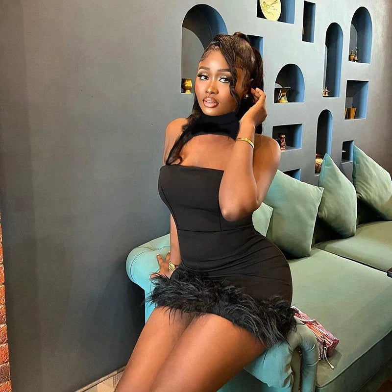 Med en trendig O-halsringning och unika fjäderdetaljer, erbjuder klänningen en iögonfallande look som passar utmärkt för festliga tillfällen. Den är tillverkad av en bekväm bomullspolyesterblandning som gör den idealisk för att dansa hela natten lång.