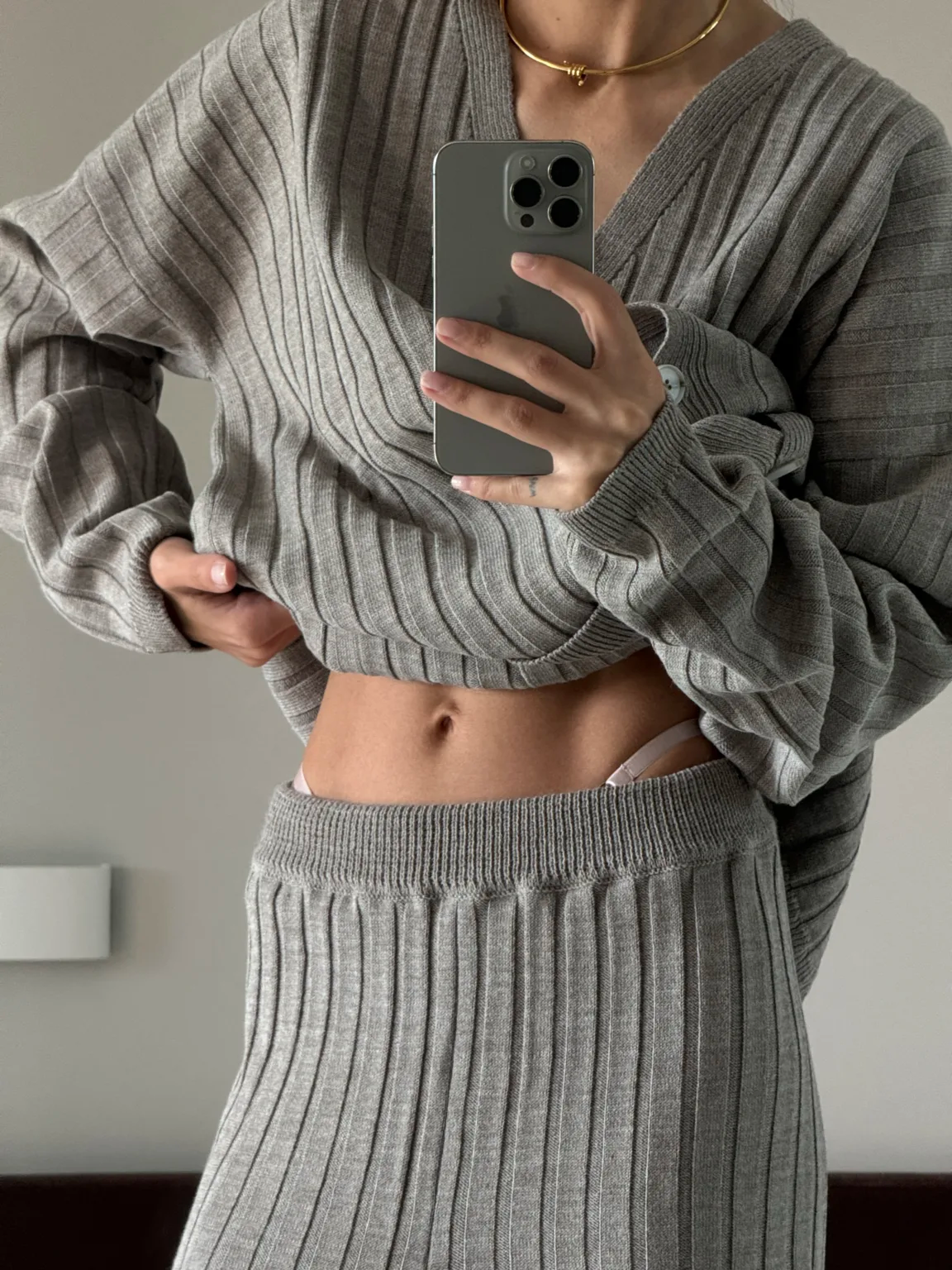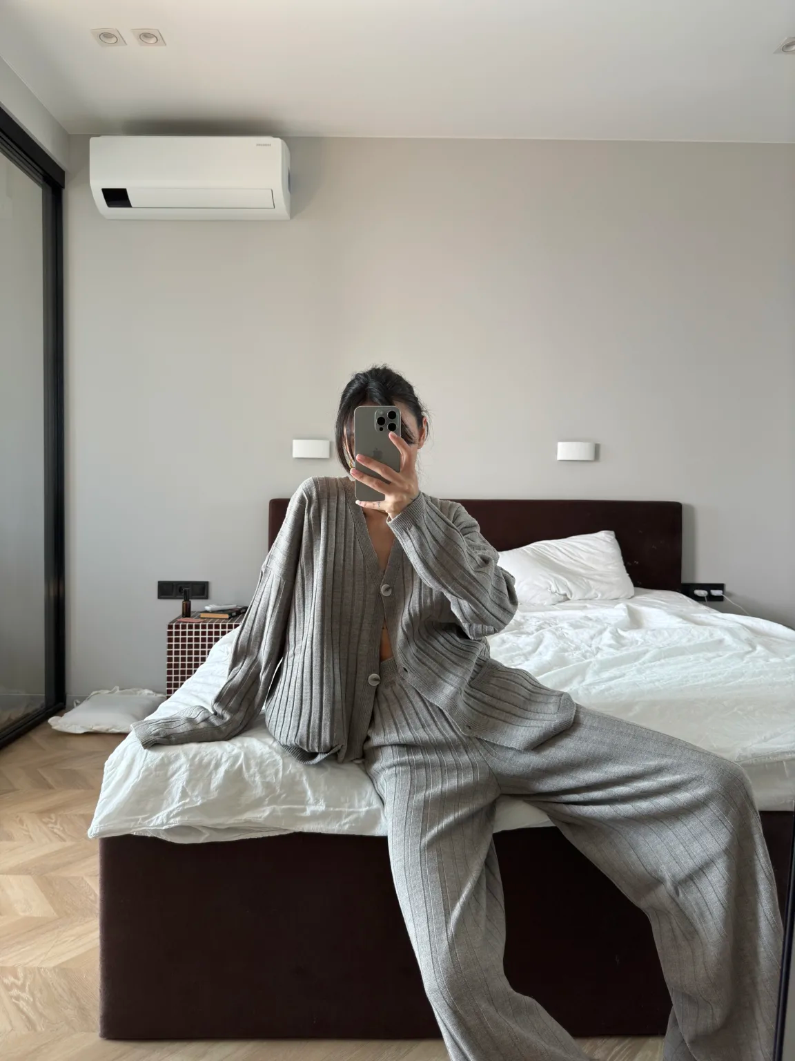 Setet består av en mjuk kofta och byxor som tillsammans skapar en mångsidig look. Den tidlösa designen gör att du kan bära delarna separat eller som en enhet, vilket gör den till ett måste i varje garderob.