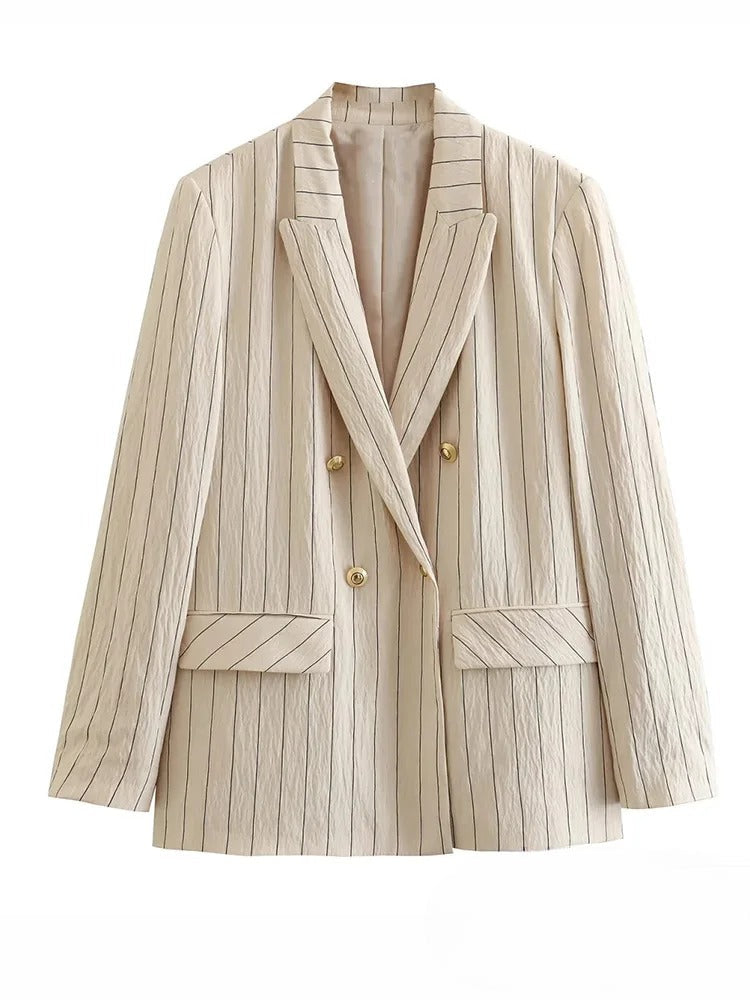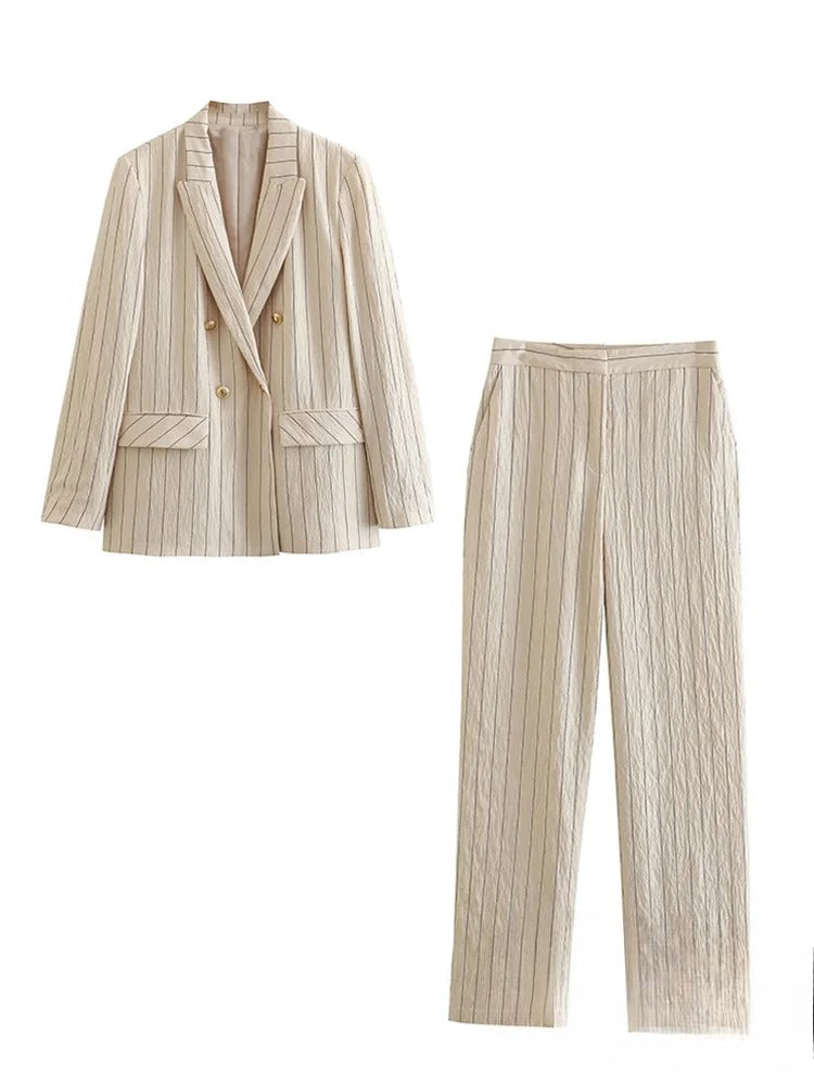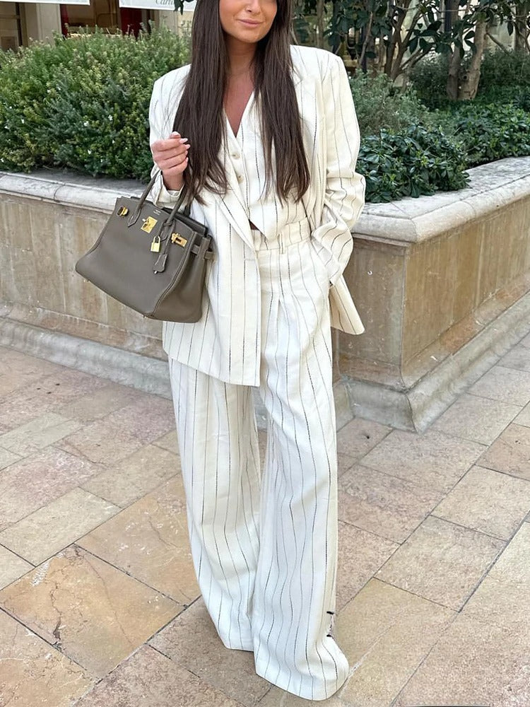 Detta set består av en stilren väst och byxor med breda ben, båda prydda med klassiska ränder som ger en tidlös känsla. Den mångsidiga designen gör det enkelt att klä upp sig för både affärsmöten och sociala tillställningar.