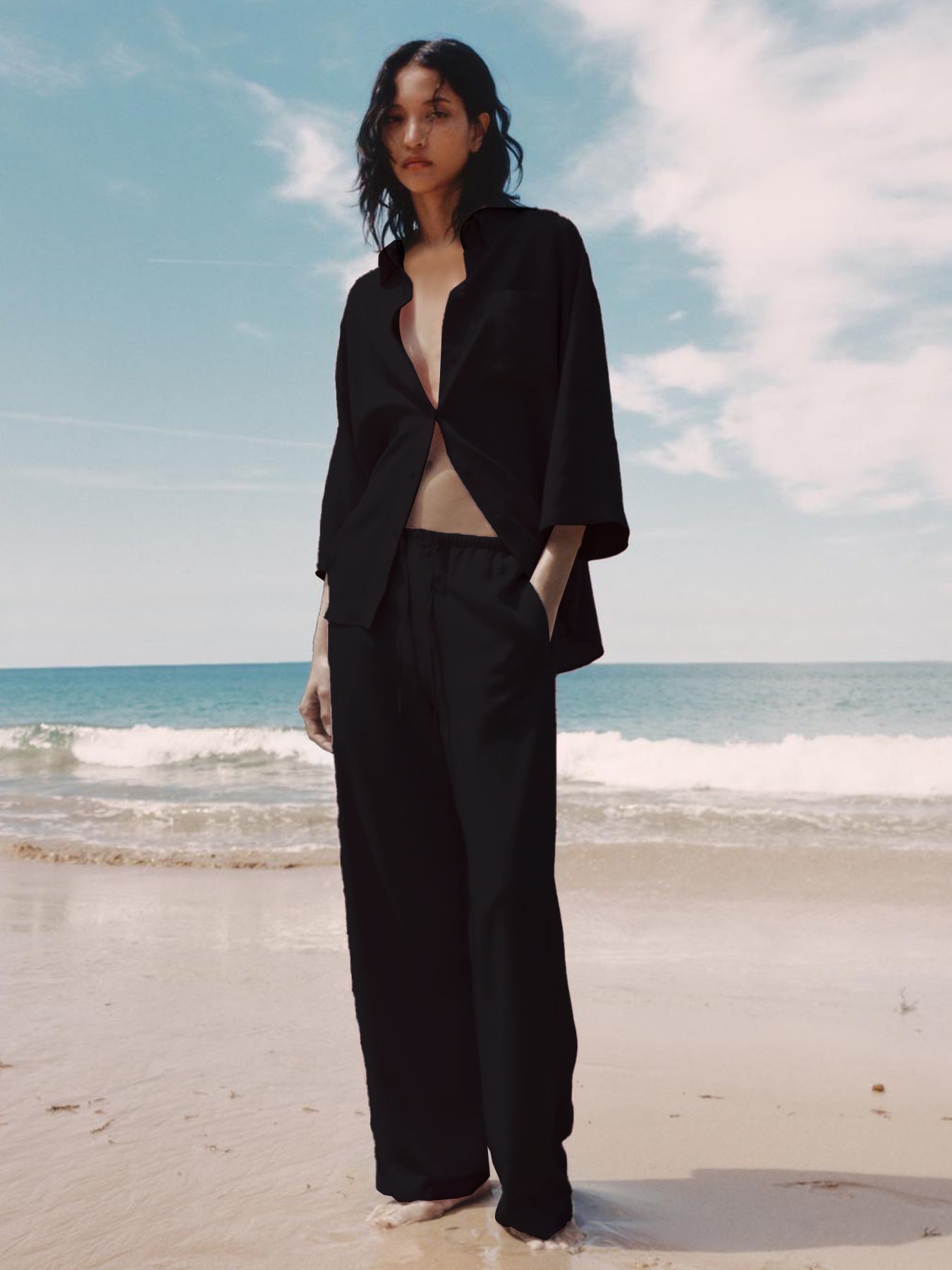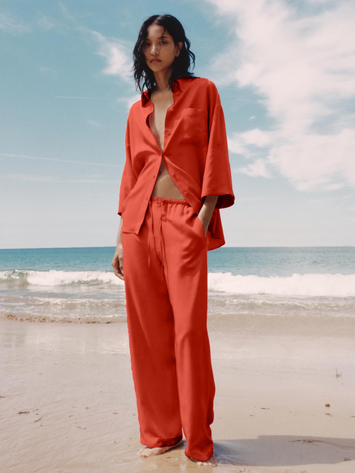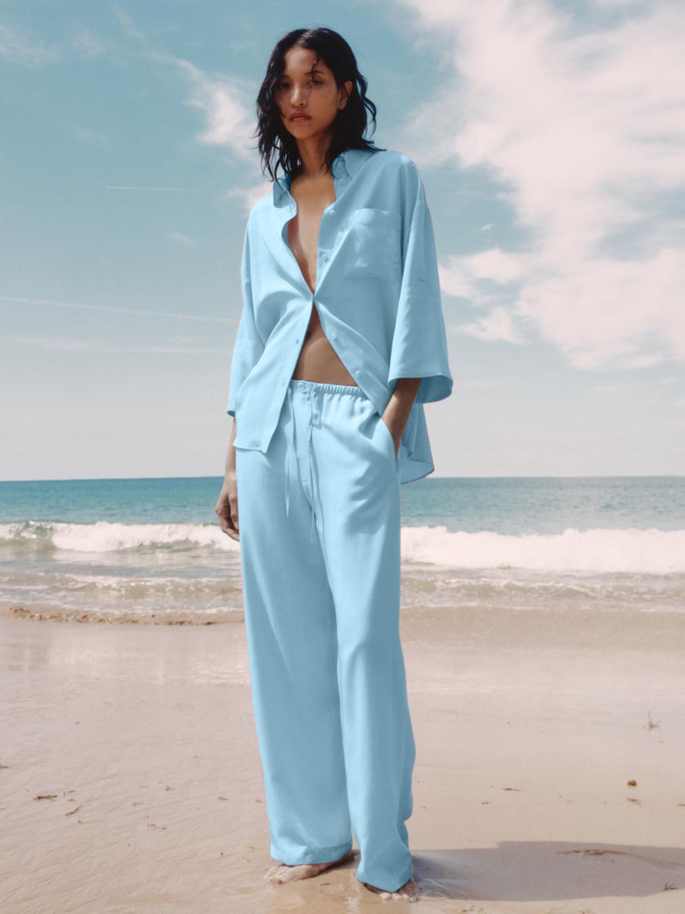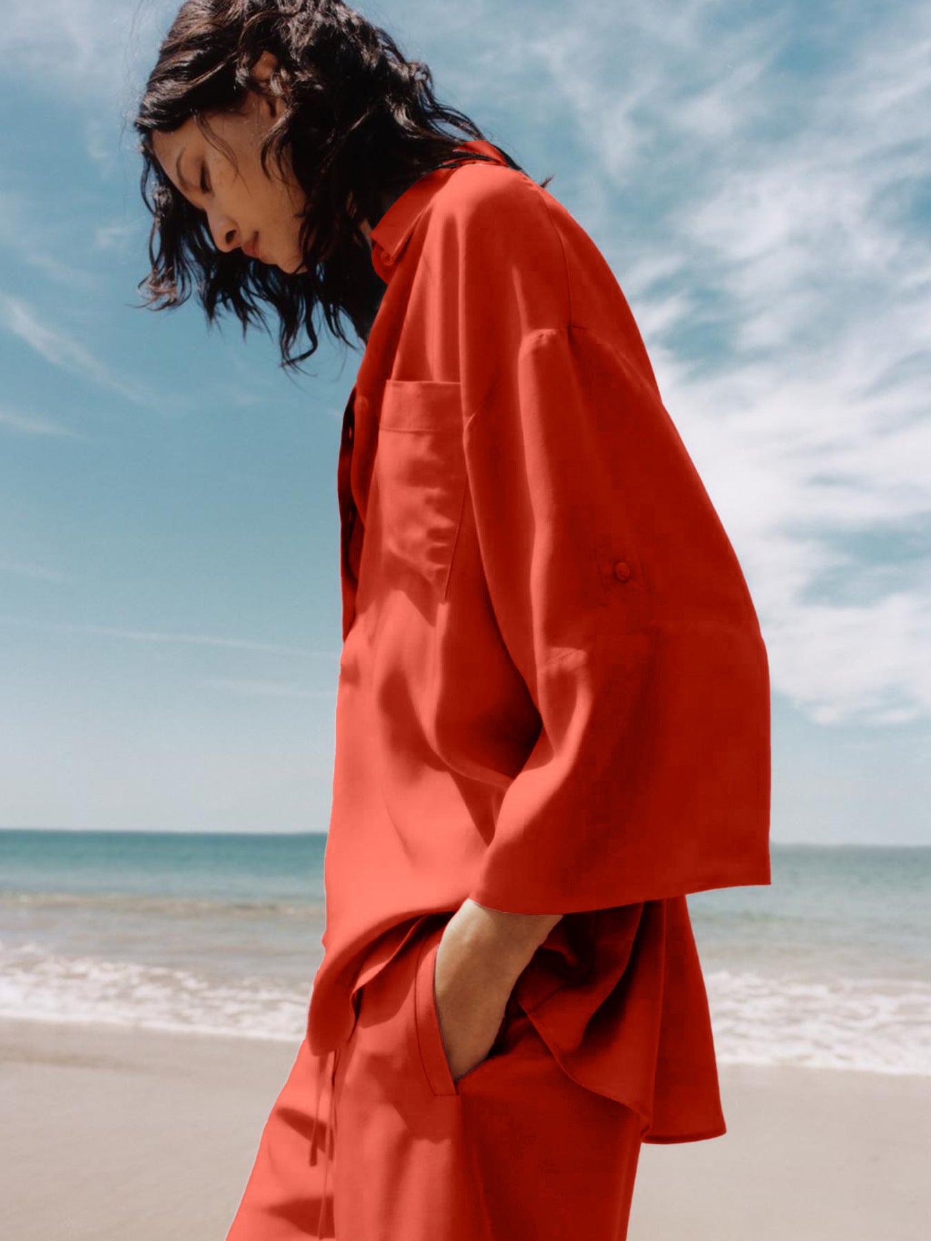 Skjortan har en satinliknande textur som ger en lyxig känsla. Med tre fjärdedelars ärmar och knappar fram, är den både praktisk och stilren. Den passar utmärkt för en dag på kontoret eller en kväll ute.