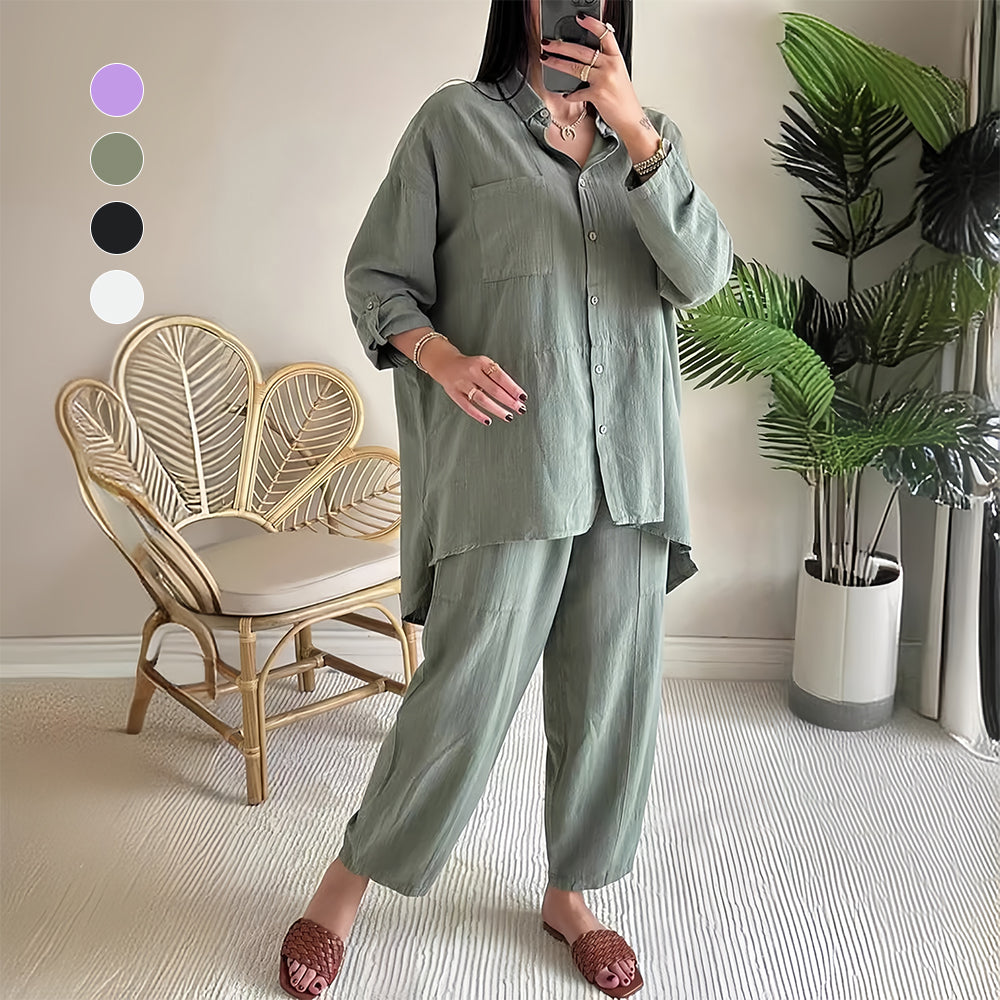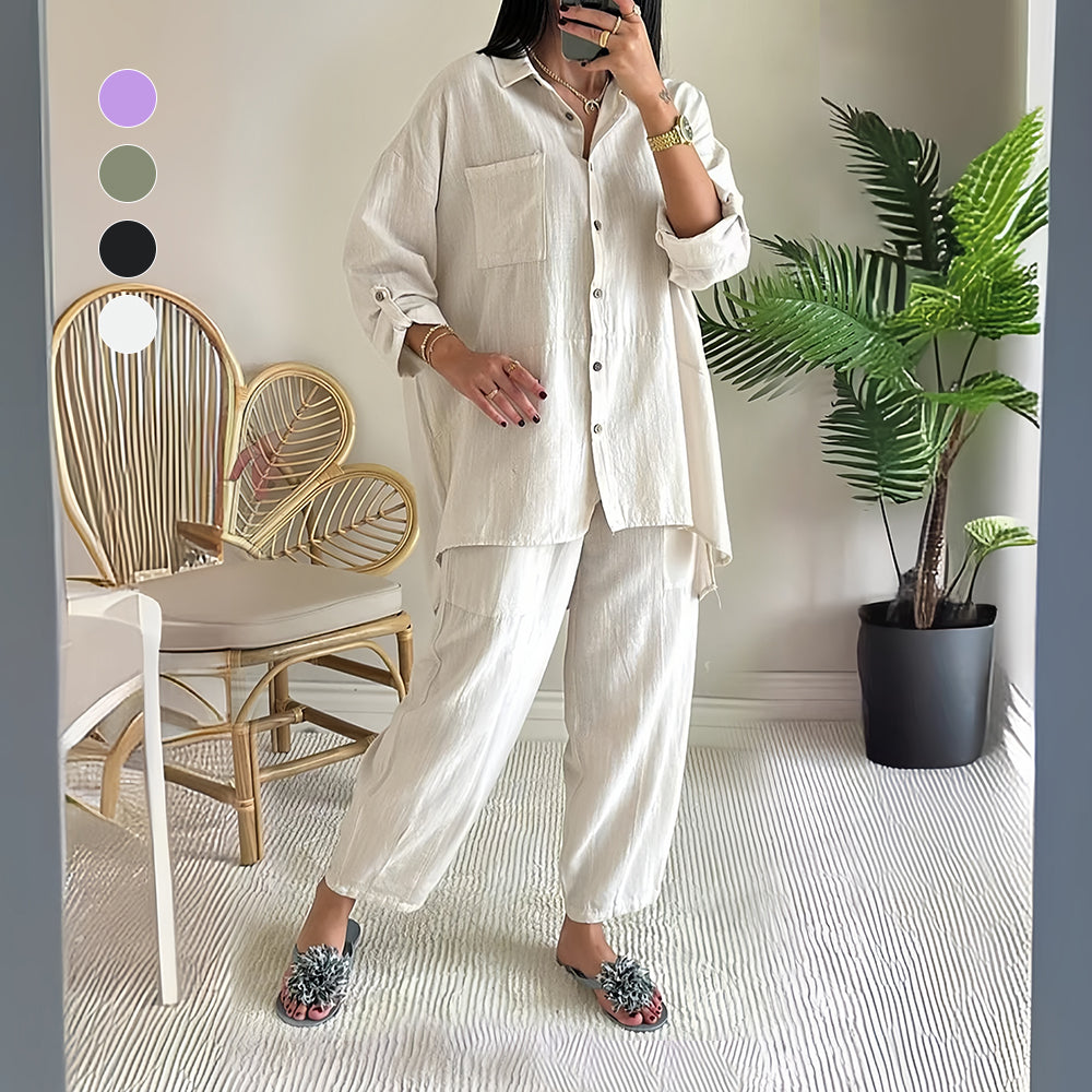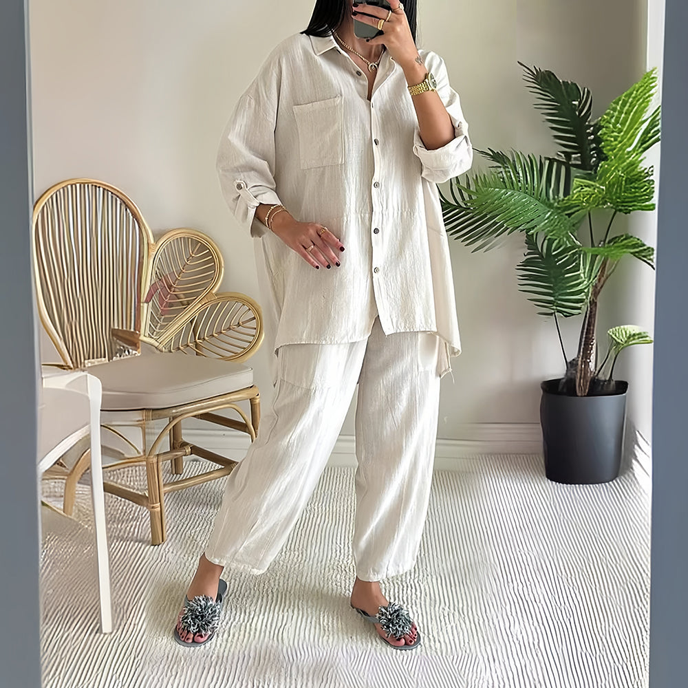 Setet är tillverkat av en blandning av bomull och linne, vilket ger en naturlig och andningsbar känsla. Den långärmade skjortan och de höga, lösa byxorna framhäver midjan och ger en smickrande silhuett. Perfekt för både avslappnade och mer formella sammanhang, detta set är en mångsidig klassiker i din garderob.