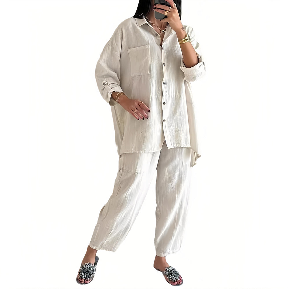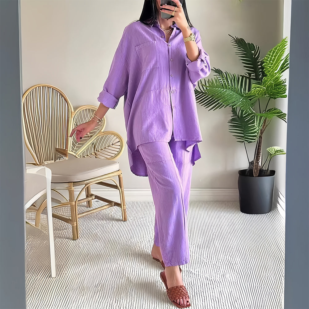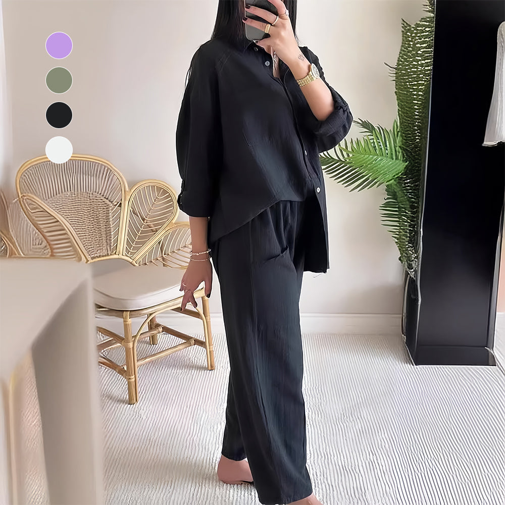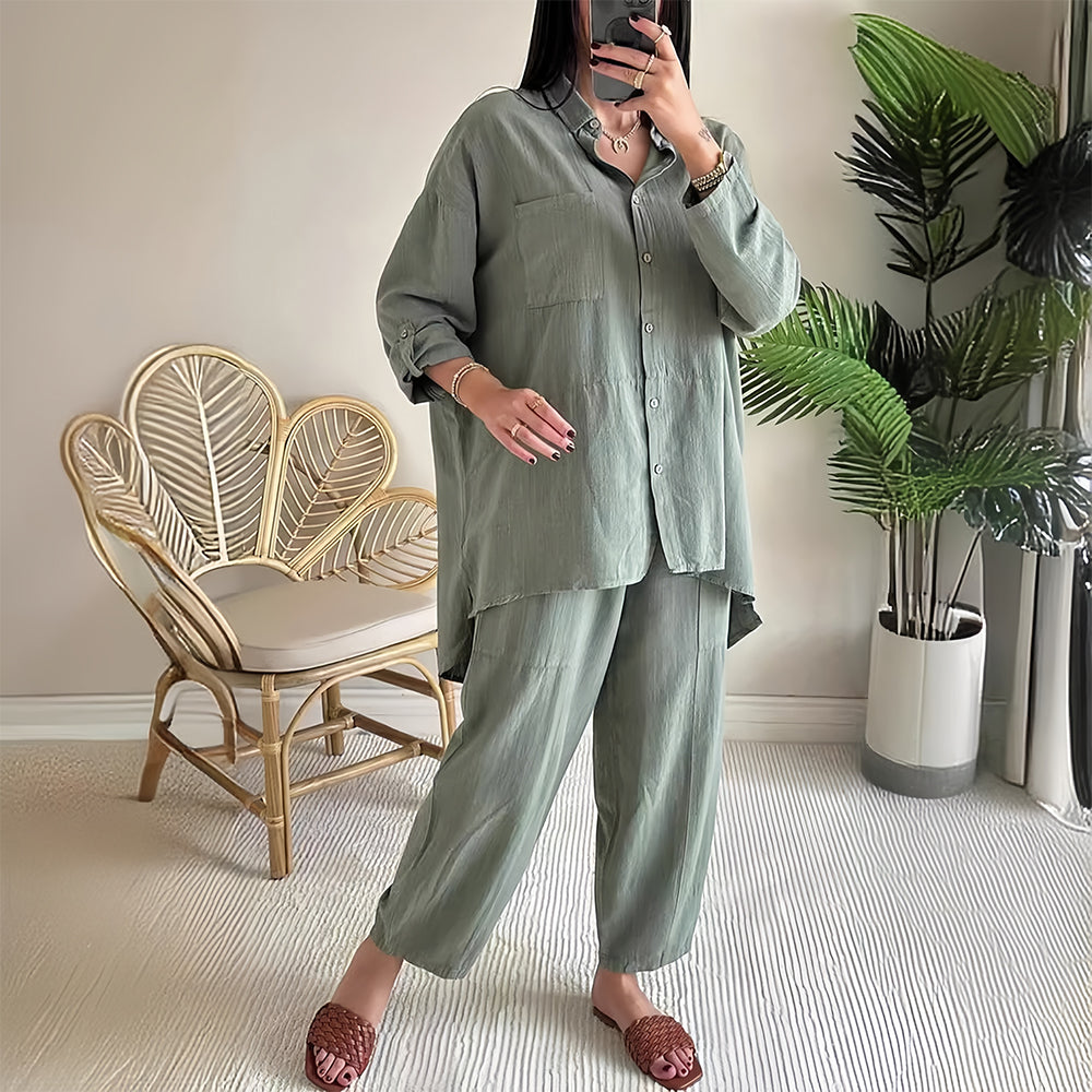 Setet är tillverkat av en blandning av bomull och linne, vilket ger en naturlig och andningsbar känsla. Den långärmade skjortan och de höga, lösa byxorna framhäver midjan och ger en smickrande silhuett. Perfekt för både avslappnade och mer formella sammanhang, detta set är en mångsidig klassiker i din garderob.