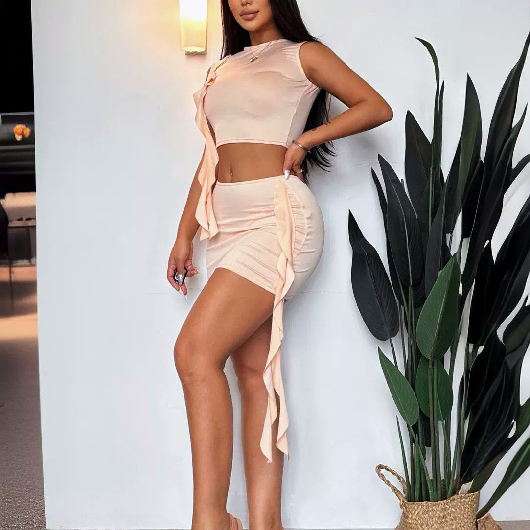 Upplev en perfekt kombination av stil och komfort med denna skördetopp och mini-rock uppsättning. Denna outfit är designad för att få dig att känna dig både elegant och avslappnad under sommardagar.