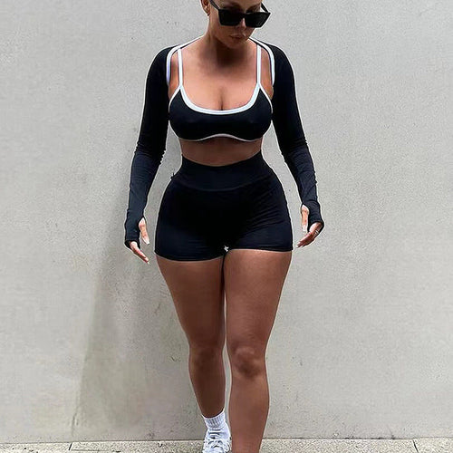 Denna uppsättning består av en långärmad topp med trendiga utskärningar och shorts med hög midja, vilket ger en smickrande silhuett. Perfekt för både gymmet och vardagsbruk, den är tillverkad av lätt och andningsbart material som säkerställer att du håller dig sval och bekväm under hela dagen.