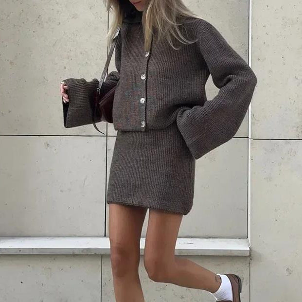 Ensemble består av en mjuk tröja och en matchande minikjol, vilket gör den idealisk för både vardag och festliga tillfällen. Med fashionabla detaljer som knappstängning och breda ärmar får du en look som verkligen sticker ut.