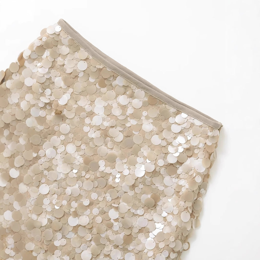 Minikjolen är prydd med paljetter i olika storlekar som reflekterar ljuset på ett vackert sätt. Den elastiska midjan ger en bekväm passform och anpassar sig perfekt till din kropp, vilket gör den idealisk för både festliga tillfällen och vardagligt bruk.