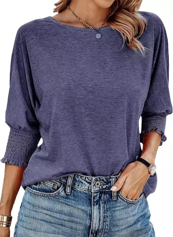 Denna topp har en modern design med lätta puffade ärmar och en cirkulär halsringning som ger en trendig silhuett. Den är idealisk för både avslappnade dagar och som en stilfull följeslagare i vardagen.