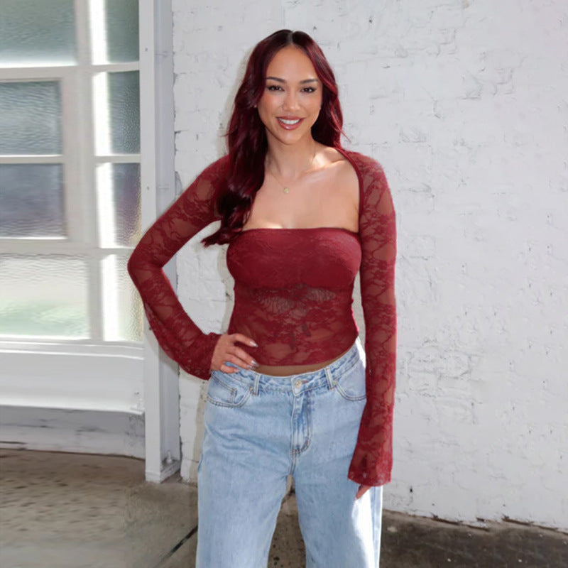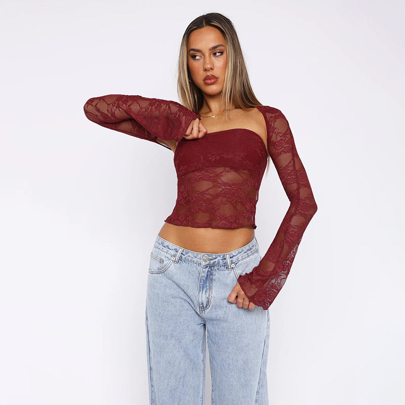 Med sina charmiga ruffles och högkvalitativa spetsmaterial, är denna topp idealisk för både festliga och speciella tillfällen. De långa ärmarna ger en elegant silhuett som smickrar din kropp och framhäver din stil.