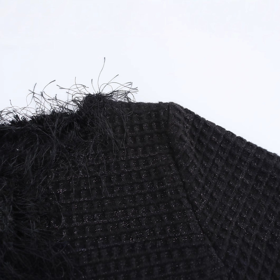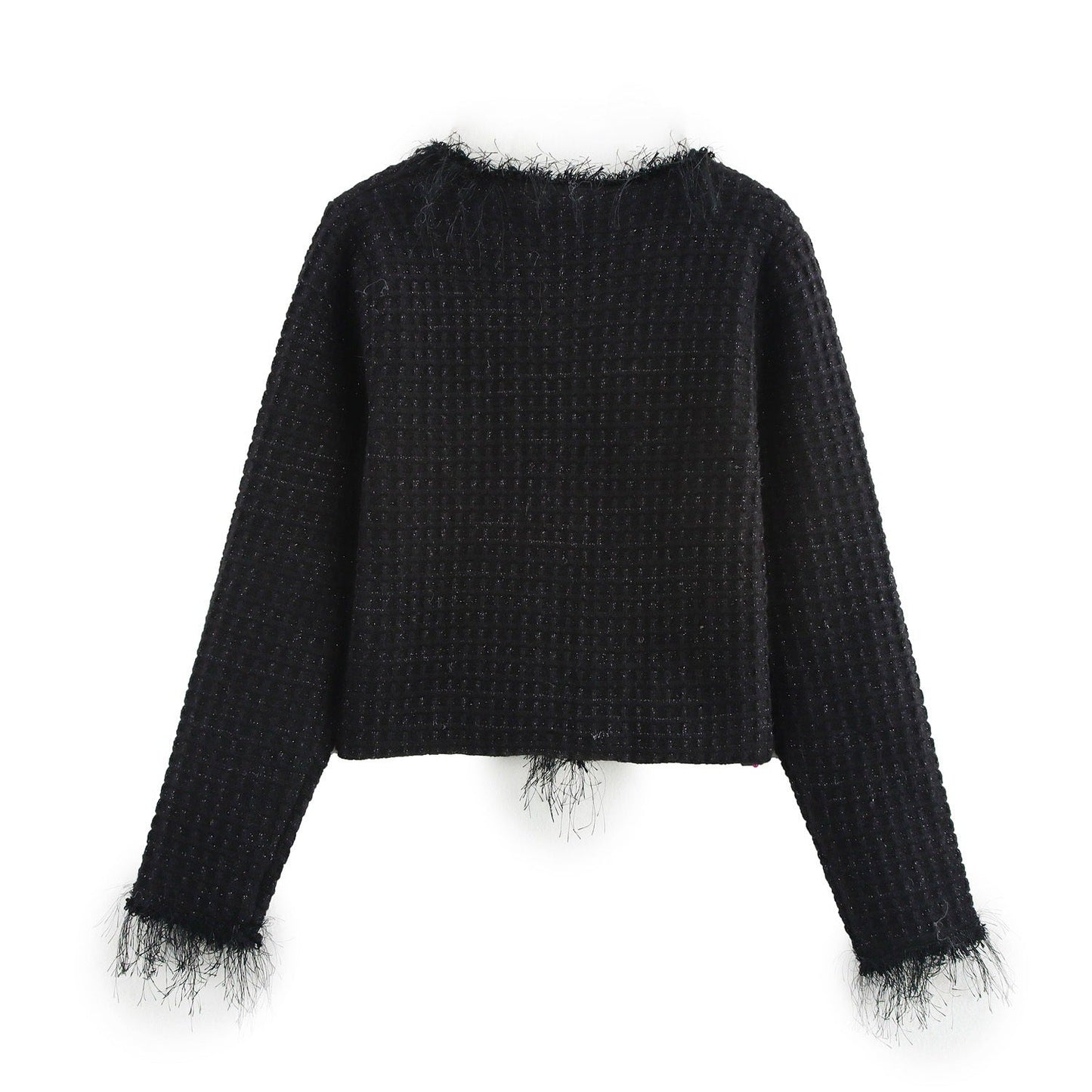 Tröjan har ett unikt strukturellt mönster som ger ett modernt och fräscht utseende. De fluffiga detaljerna på ärmarna och kragen tillför en sofistikerad touch, vilket gör den idealisk för både vardag och fest.
