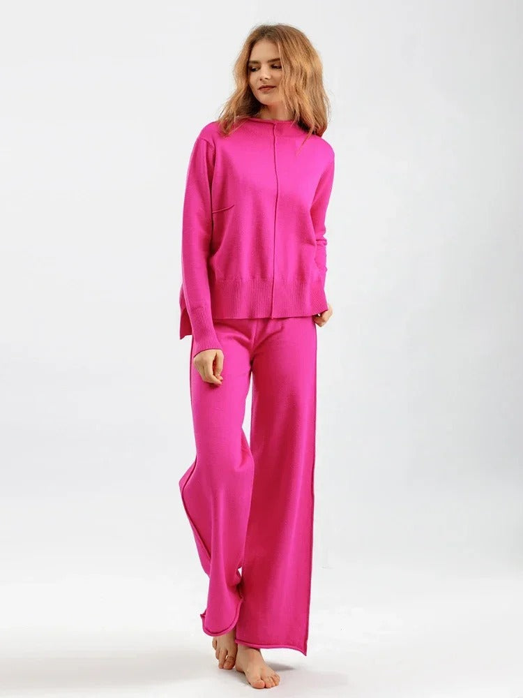 Denna outfit består av högmidjade byxor som ger en smickrande silhuett och en mysig tröja som tillför både värme och stil. Den är idealisk för både avslappnade och semi-formella tillfällen, vilket gör att du enkelt kan gå från dag till natt med stil.