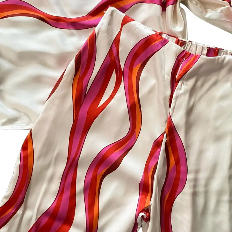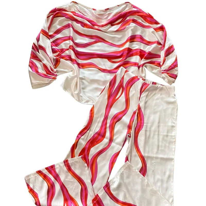 Med ett elegant mönster och en modern silhuett, är denna uppsättning idealisk för både vardag och fest. Off-shoulder-designen ger en romantisk touch, medan de breda benbyxorna erbjuder både stil och rörelsefrihet.