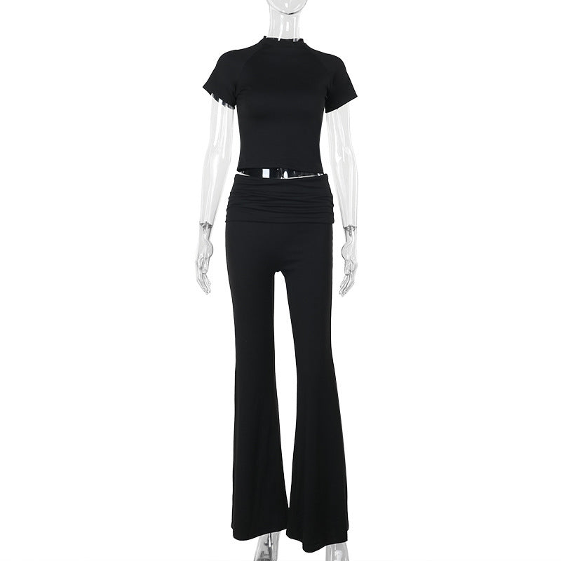 Upplev en perfekt kombination av stil och komfort med vår damuppsättning. Den korta toppen och de breda byxorna ger en avslappnad men ändå elegant look som passar för alla tillfällen.