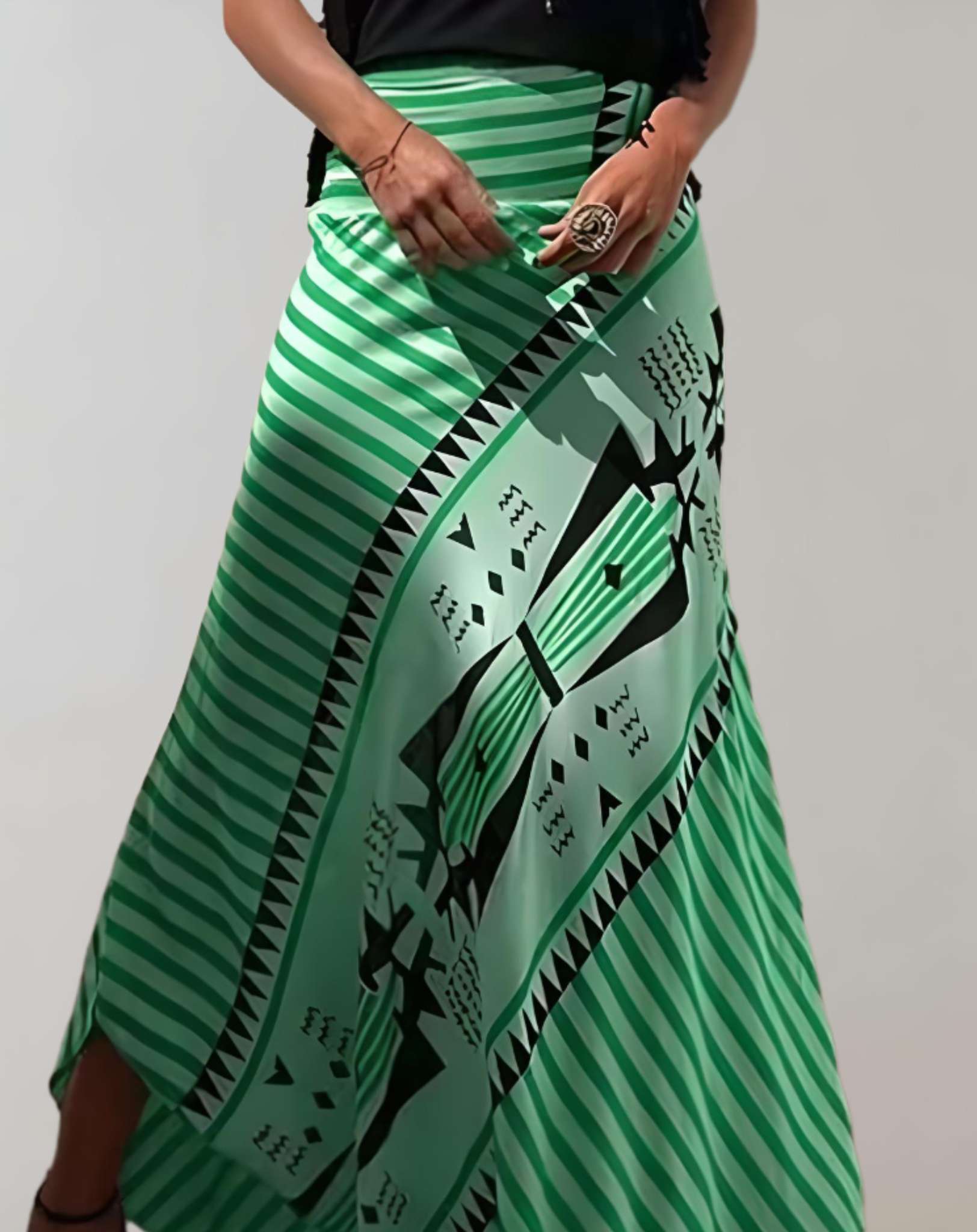 Denna kjol har ett unikt slumpmönstertryck som ger en modern touch. Den är idealisk för både formella och avslappnade tillfällen, vilket gör den till ett mångsidigt plagg i din garderob.