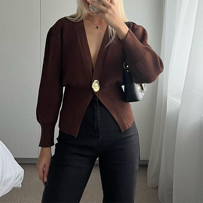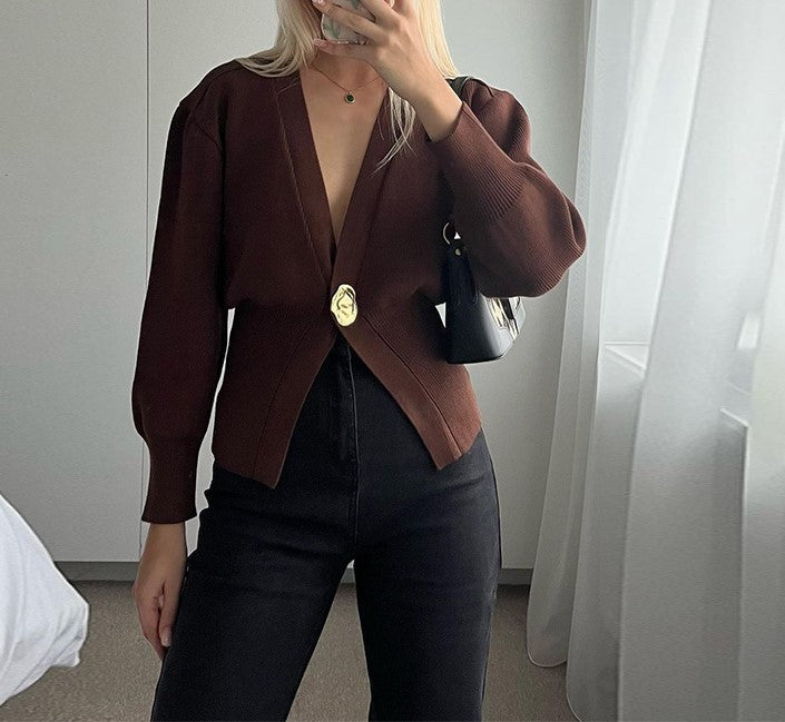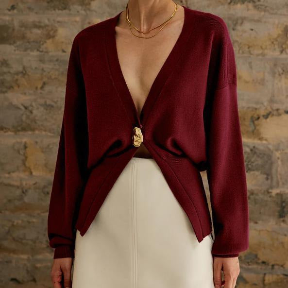 Designad för att passa både avslappnade och mer formella sammanhang, har denna cardigan en V-hals och en unik knappdetalj som ger en extra touch av stil. De långa, breda ärmarna bidrar till en avslappnad passform som gör den idealisk för alla säsonger.