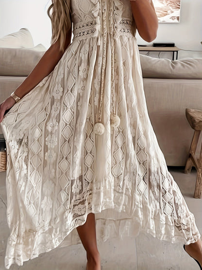 Designad för både avslappnade och mer formella tillfällen, erbjuder klänningen en smickrande V-ringning och en stilren tofsdekoration. Den är idealisk för strandbesök eller för att utforska nya platser, vilket gör den till ett mångsidigt val för alla säsonger.