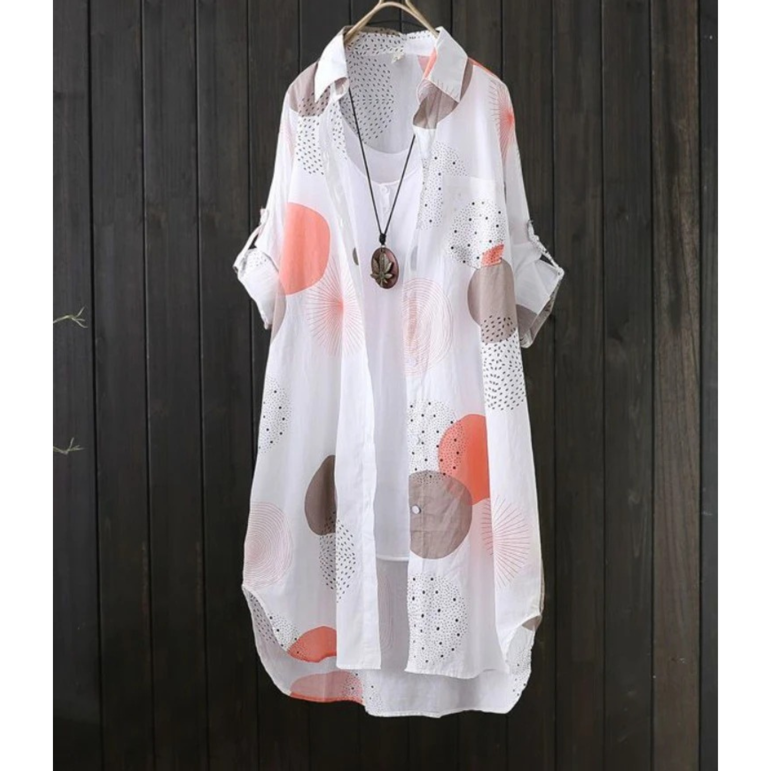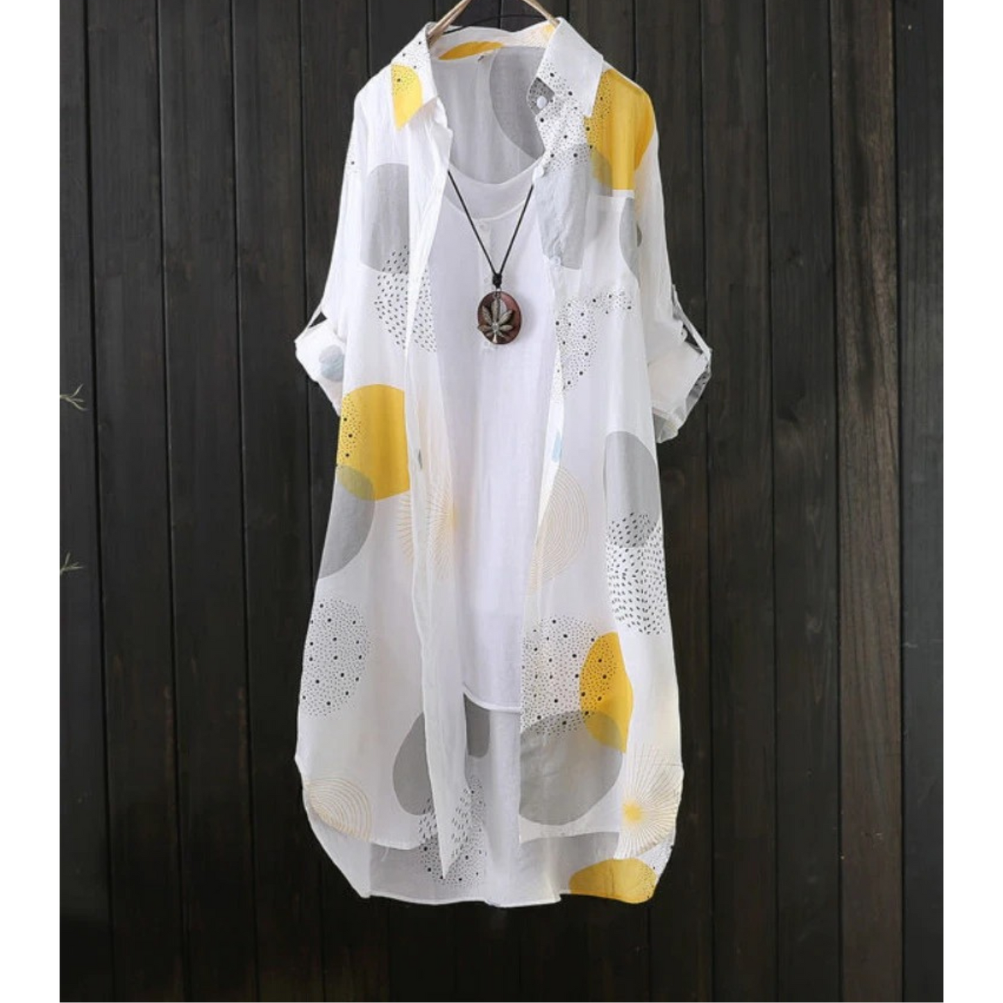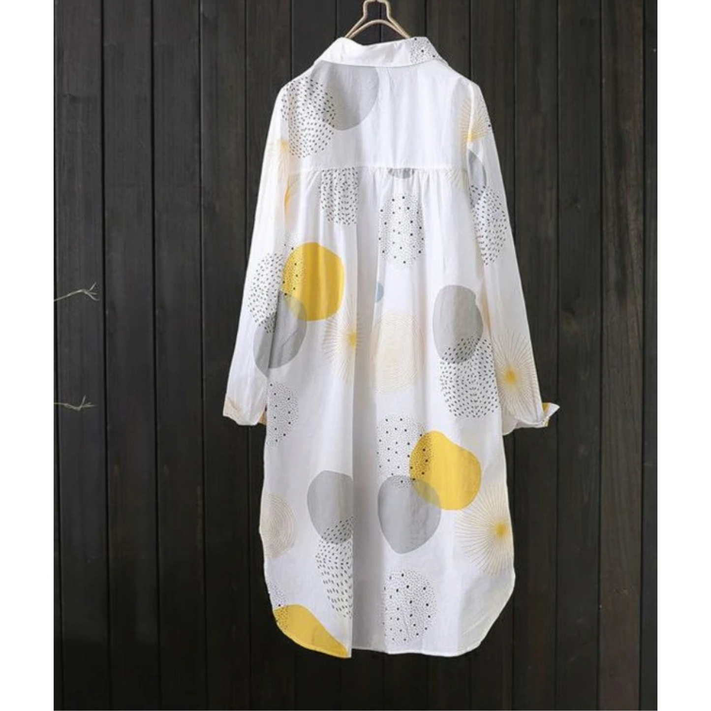 Skjortablusklänningen är utformad med ett unikt affärstryck som gör den idealisk för både kontoret och sociala evenemang. Med sin moderna silhuett och noggrant utvalda material erbjuder den en lyxig känsla och en smickrande passform som passar alla kroppstyper.