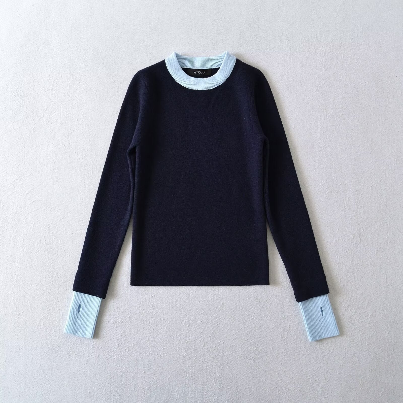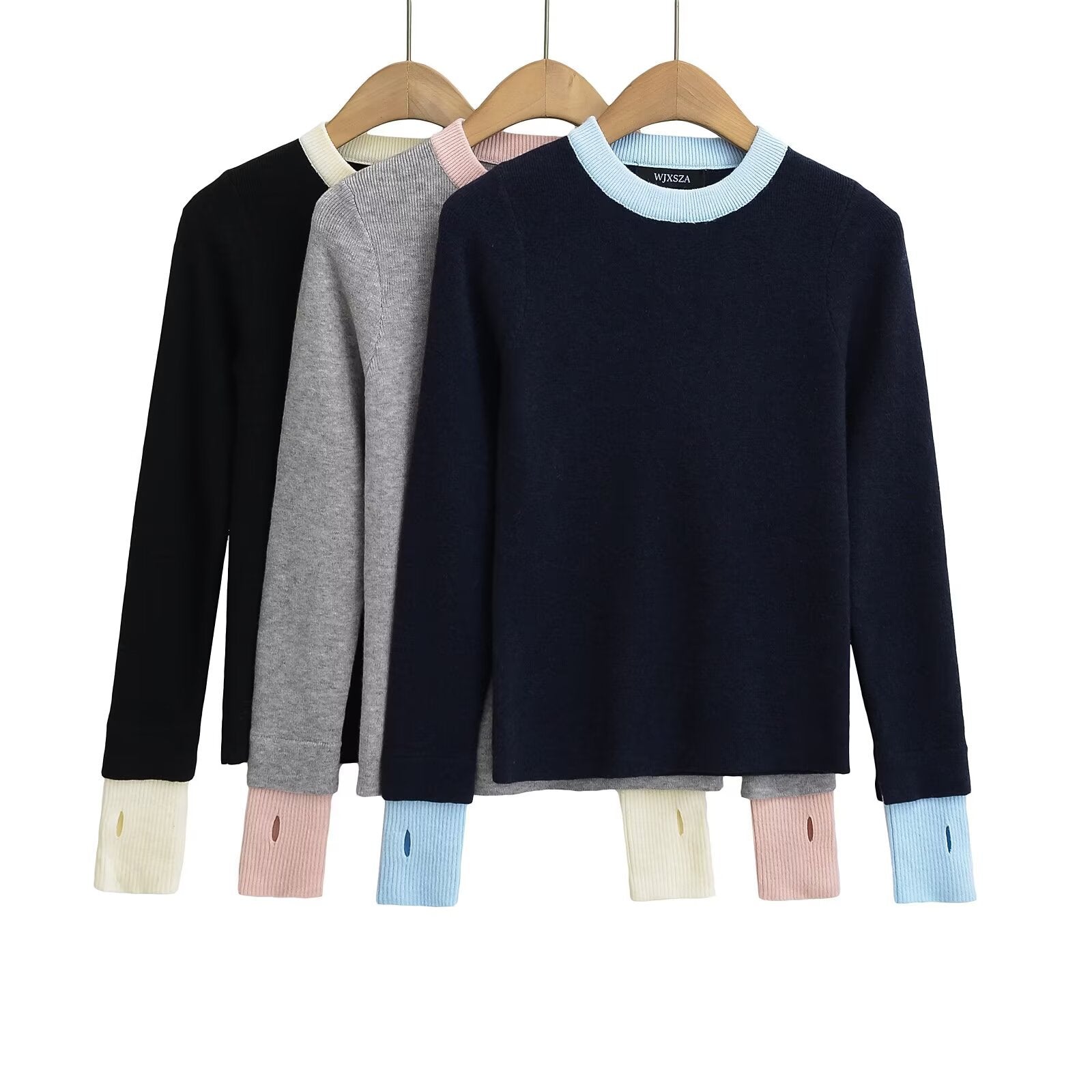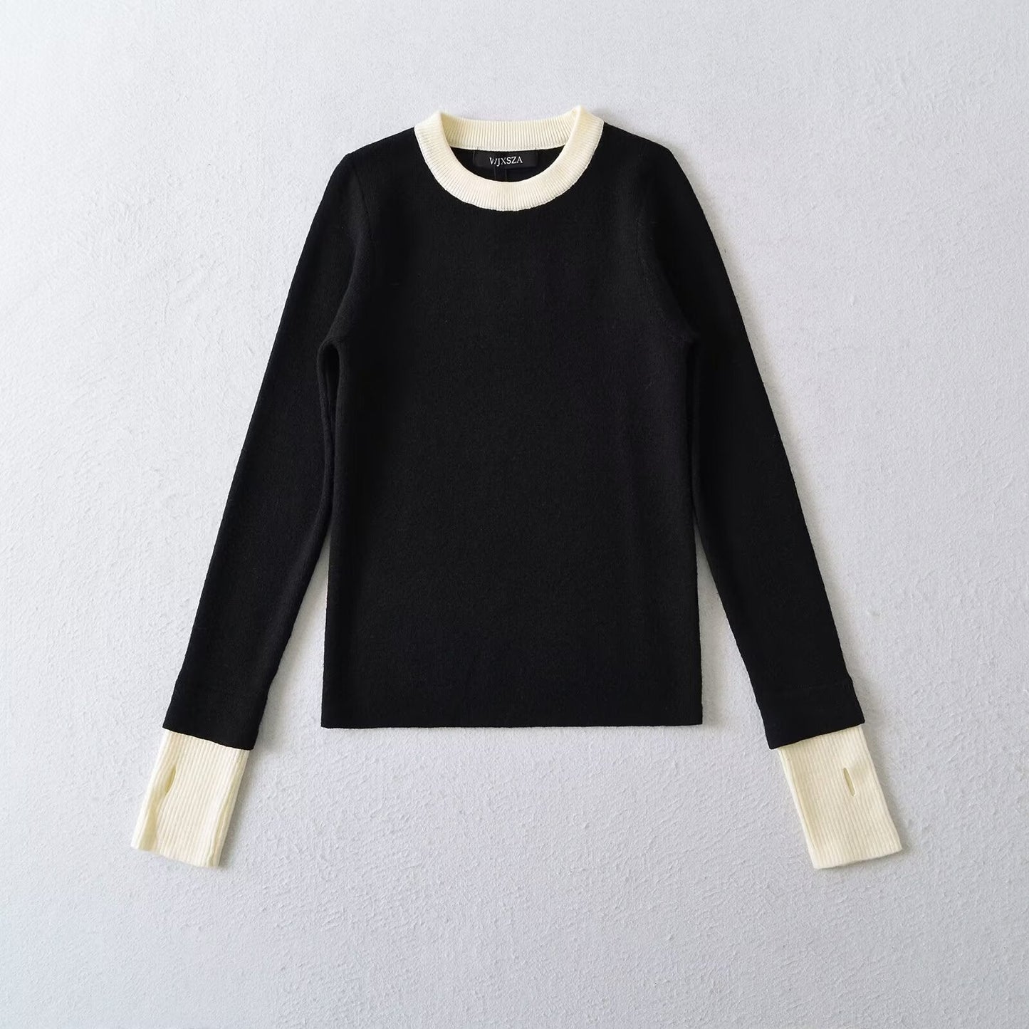 Tröjan har en klassisk cirkulär halsringning och trendiga kontrasterande manschetter som ger en modern touch. Den är idealisk för både vardag och fest, och kan enkelt stylas med olika plagg för att skapa en mångsidig look.